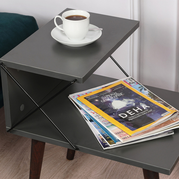 Βοηθητικό τραπεζάκι με μοντέρνο σχεδιασμό σε γκρι χρώμα. Χάρη στον πρωτότυπο σχεδιασμό του, προσφέρει αποθηκευτικό χώρο στο κάτω μέρος για τα περιοδικά, τα βιβλία ή ότι άλλο επιθυμείτε. Iδανικό για να στολίσει τον χώρο του καθιστικού σας, με ποιότητα και στυλ. Μπορεί να χρησιμοποιηθεί και σαν κομοδίνο στην κρεβατοκάμαρά σας. Το προϊόν έρχεται αμοντάριστο και συναρμολογείται βάσει οδηγιών.