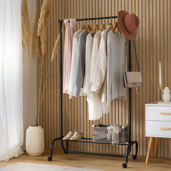 Ράγα ρούχων δαπέδου για τα ρούχα σας σε μαύρο χρώμα. Έχει ρυθμιζόμενο ύψος για να κρεμάτε μακριά ρούχα όπως φορέματα και παλτό. Είναι τροχήλατη, καθώς έχει ροδάκια για να μετακινείται εύκολα. Ιδανική για να δημιουργήσετε επιπλέον αποθηκευτικό χώρο για τα ρούχα σας.
