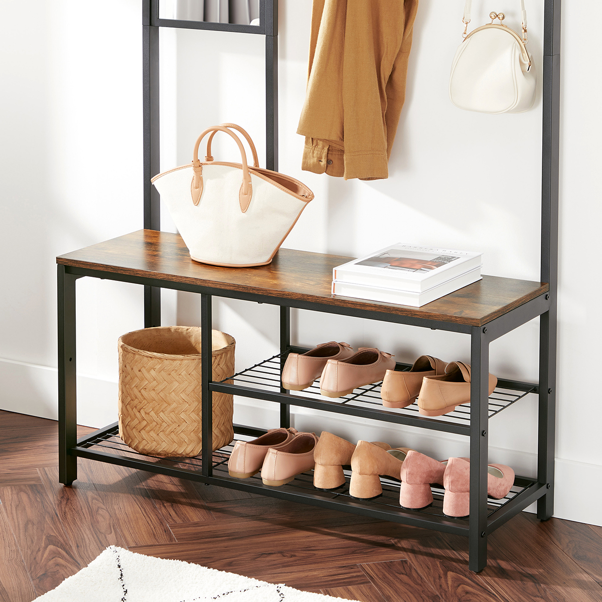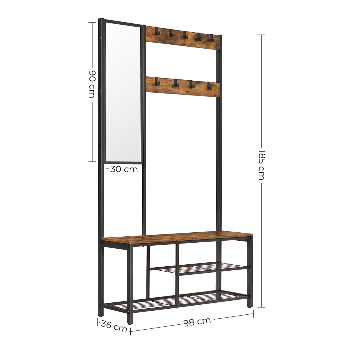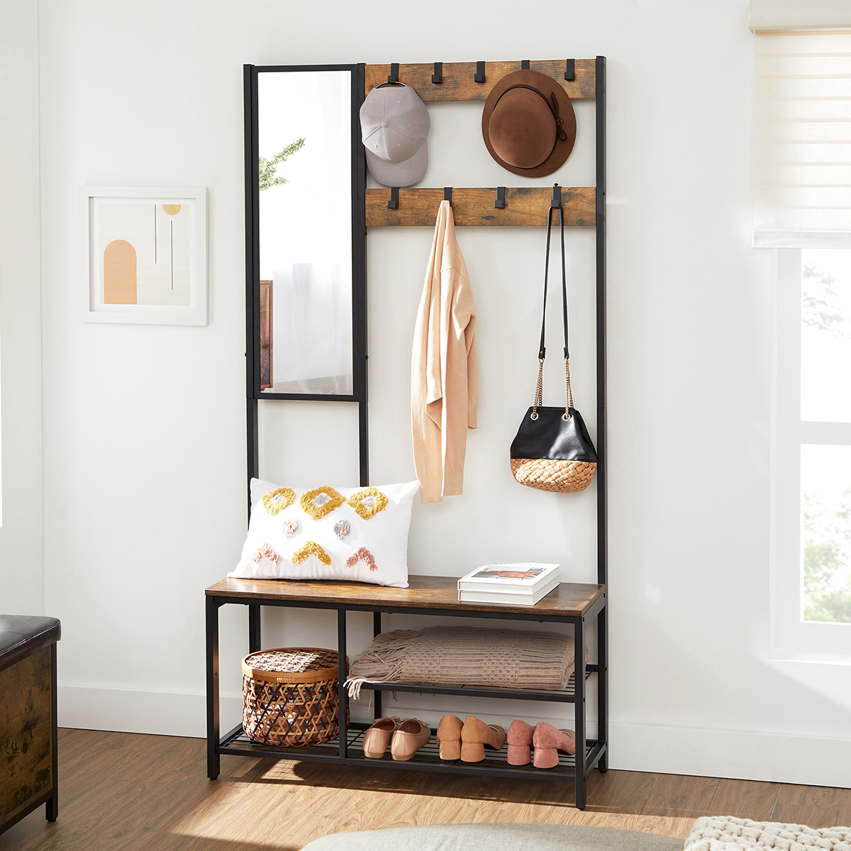 Έπιπλο εισόδου - πορτ μαντώ με καθρέφτη και μοντέρνο σχεδιασμό από την εταιρεία Vasagle. Είναι κατασκευασμένο από μοριοσανίδα σε καφέ ρουστίκ χρώμα και έχει μαύρο μεταλλικό σκελετό. Διαθέτει 9 γάντζους για να κρεμάτε ρούχα ή αξεσουάρ. Στο κάτω μέρος έχει 2 ράφια για να τοποθετήσετε τα πράγματα σας ή τα παπούτσια σας και μπορούν να χωρέσουν έως 7 ζευγάρια. Η ξύλινη επιφάνεια μπορεί να χρησιμοποιηθεί και ως χώρος για να ακουμπάτε αντικείμενα αλλά και ως κάθισμα για όταν βάζετε ή βγάζετε τα παπούτσια σας. Διαθέτει τάπες για να μην φθείρει το πάτωμα. Συνδυάστε το με τα υπόλοιπα είδη της ίδιας σειράς για ένα ολοκληρωμένο αποτέλεσμα στο χώρο σας. *Το προϊόν έρχεται αμοντάριστο και συναρμολογείται βάσει οδηγιών.*