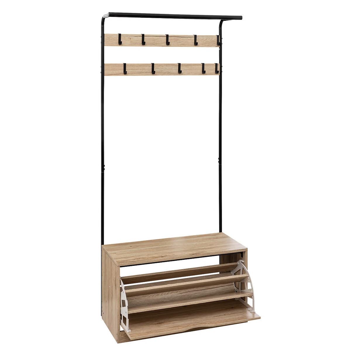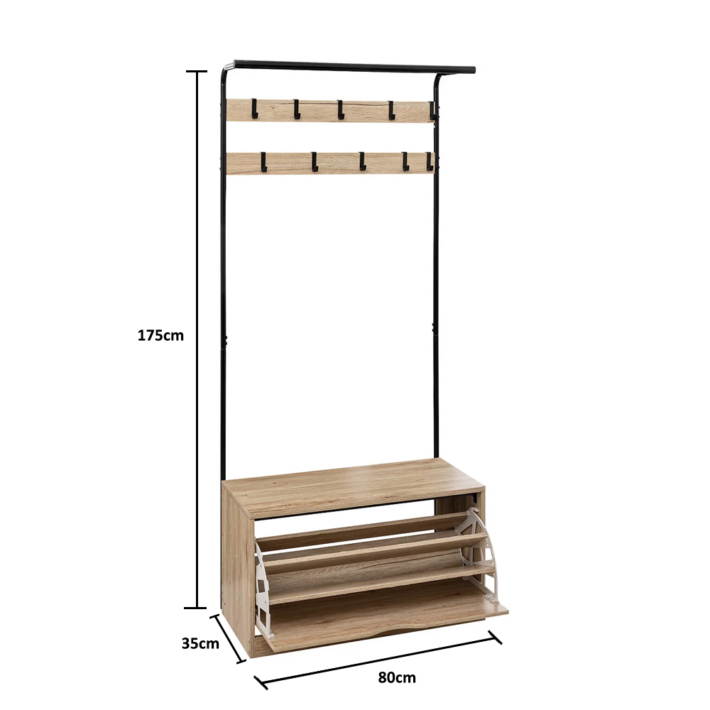 Έπιπλο εισόδου - πορτ μαντώ με παπουτσοθήκη και μοντέρνο σχεδιασμό σε φυσικό μπεζ χρώμα. Διαθέτει γατζάκια για να κρεμάτε τα παλτό και τα ρούχα σας και ράφι για να ακουμπάτε τις τσάντες σας ή ό,τι άλλο θέλετε. Το προϊόν έρχεται αμοντάριστο και συναρμολογείται βάσει οδηγιών.