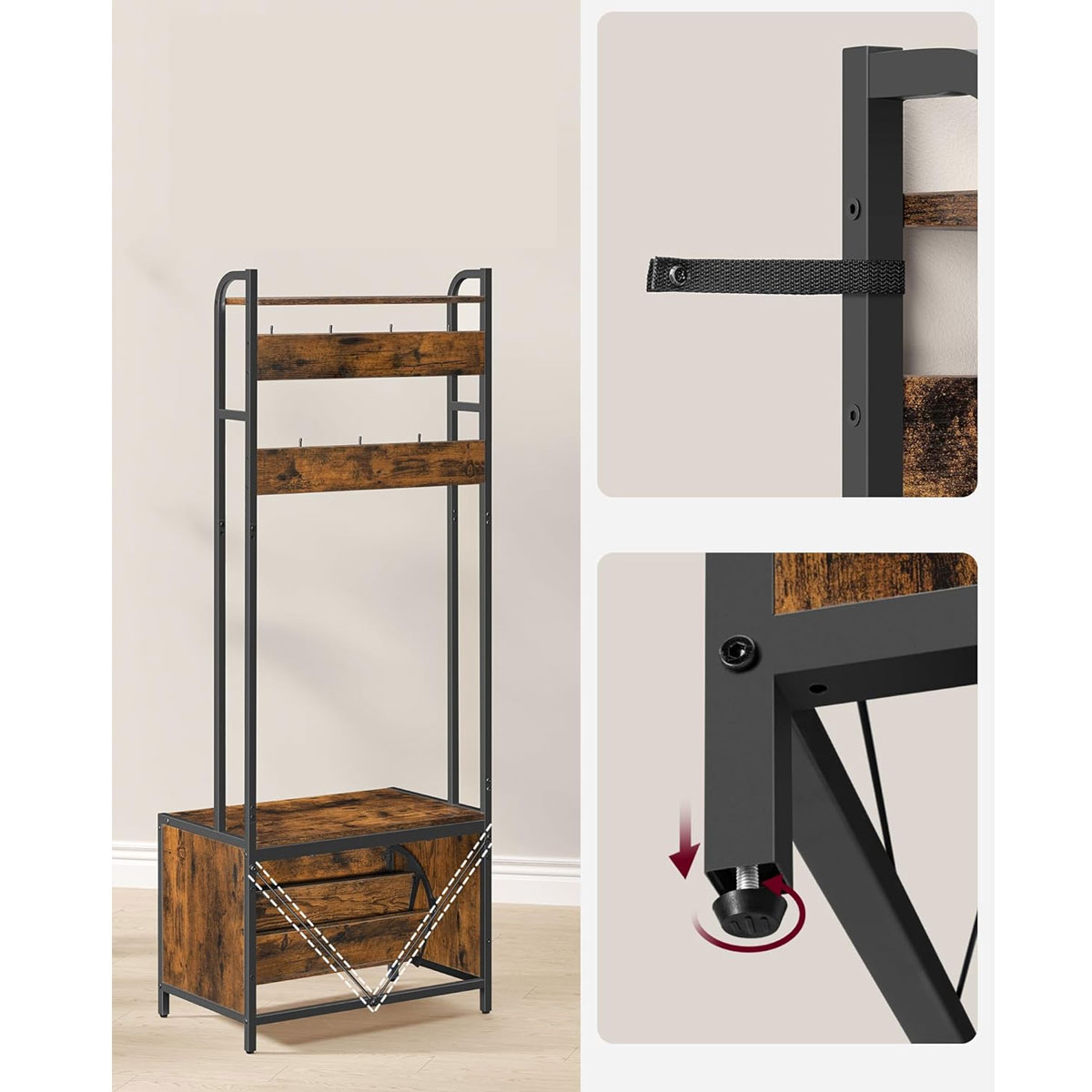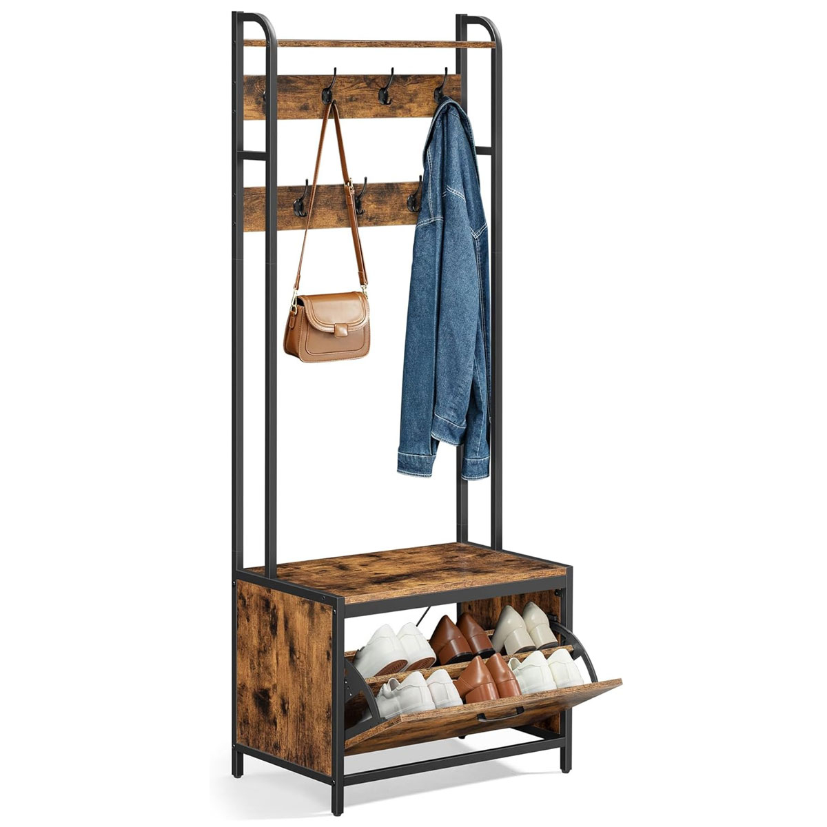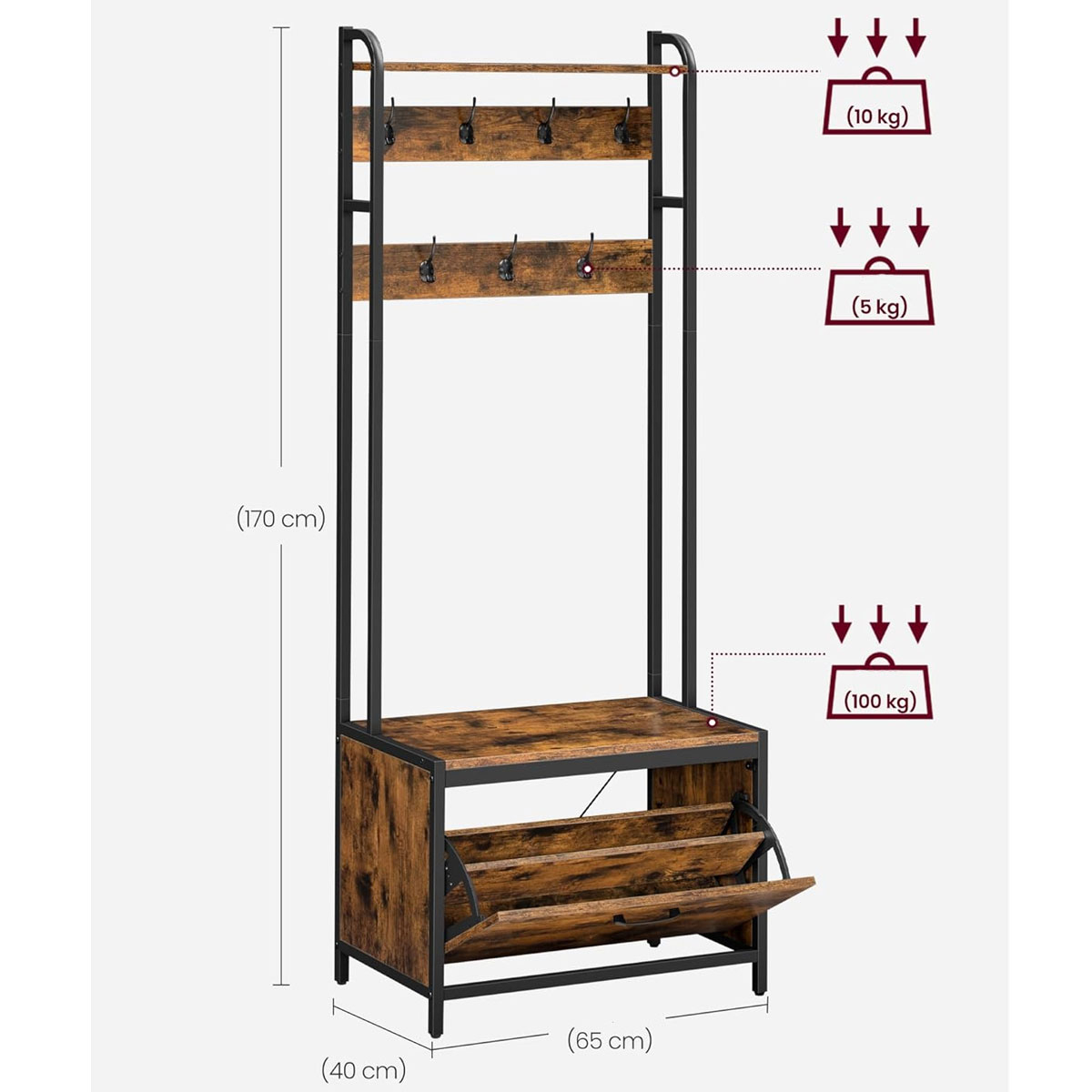 Έπιπλο εισόδου - πορτ μαντώ σε καφέ ρουστίκ χρώμα, με παπουτσοθήκη και μοντέρνο σχεδιασμό από την εταιρεία Vasagle. Διαθέτει γαντζάκια για να κρεμάτε τα παλτό και τα ρούχα σας και χώρο για να κάθεστε και να βάζετε τα παπούτσια σας ή για να ακουμπάτε τα πράγματά σας. Το προϊόν έρχεται αμοντάριστο και συναρμολογείται βάσει οδηγιών.