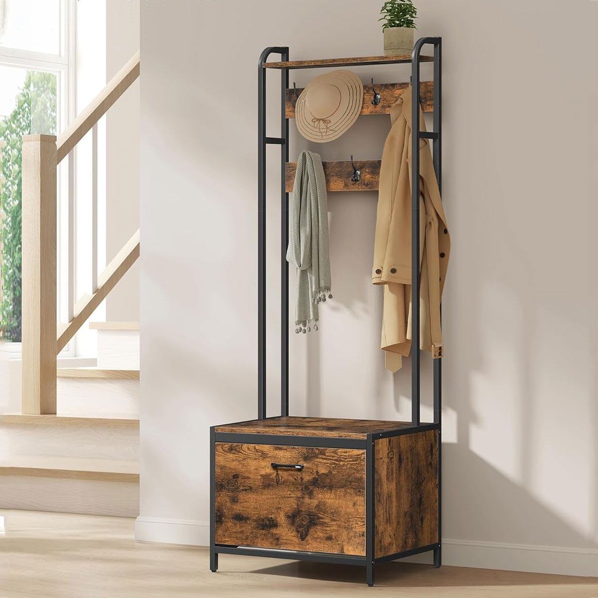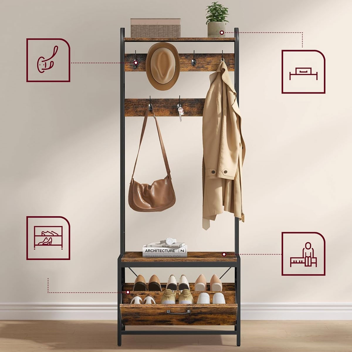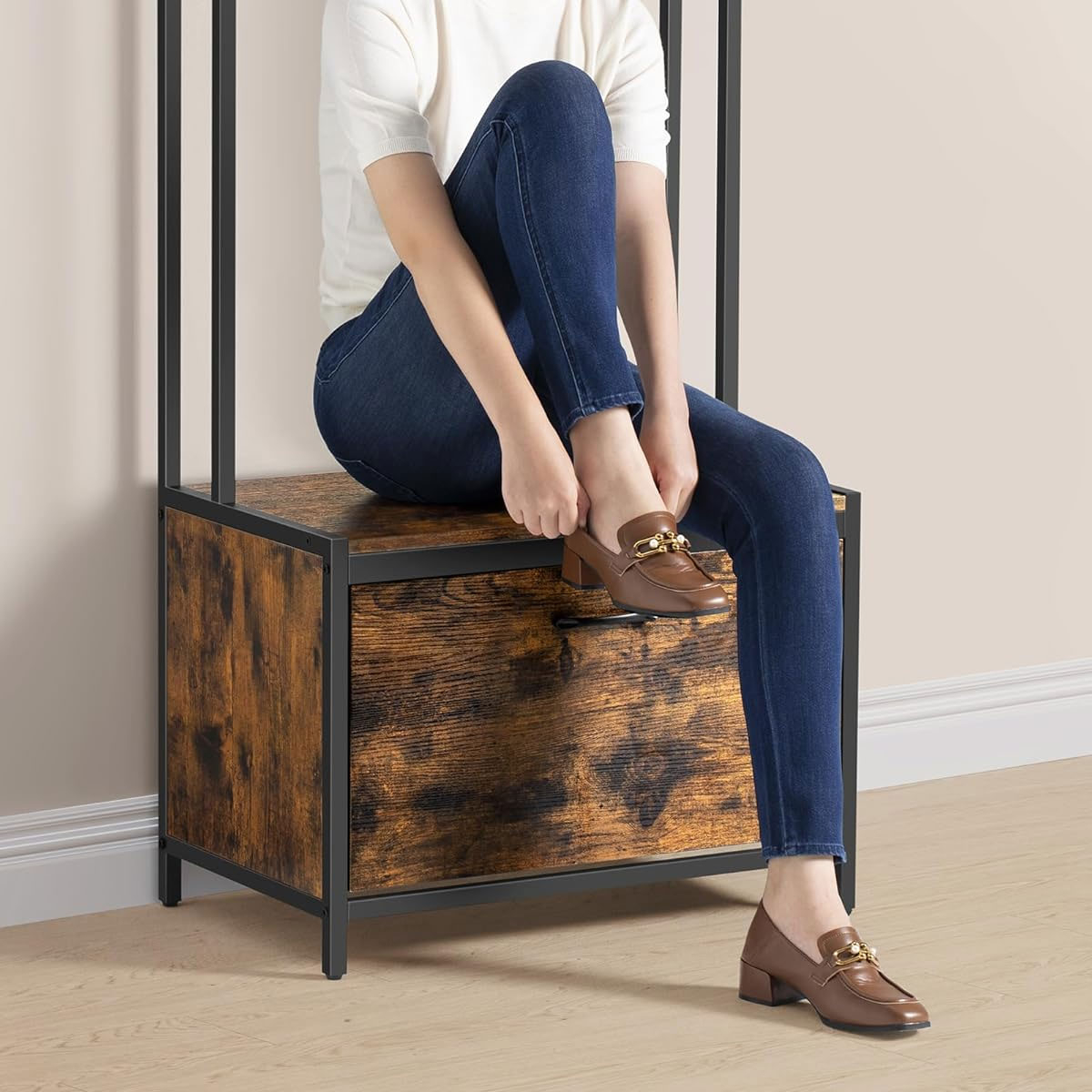 Έπιπλο εισόδου - πορτ μαντώ σε καφέ ρουστίκ χρώμα, με παπουτσοθήκη και μοντέρνο σχεδιασμό από την εταιρεία Vasagle. Διαθέτει γαντζάκια για να κρεμάτε τα παλτό και τα ρούχα σας και χώρο για να κάθεστε και να βάζετε τα παπούτσια σας ή για να ακουμπάτε τα πράγματά σας. Το προϊόν έρχεται αμοντάριστο και συναρμολογείται βάσει οδηγιών.