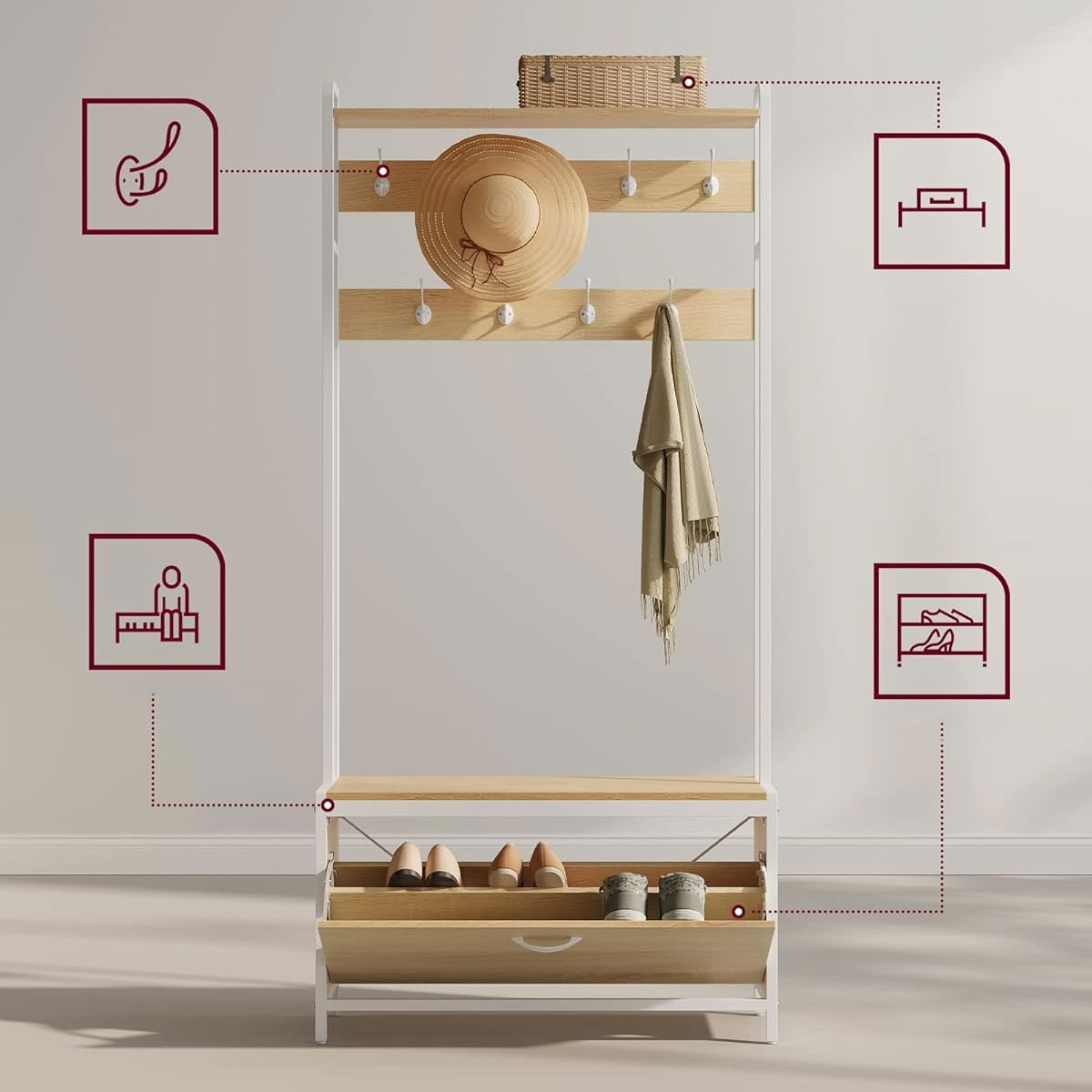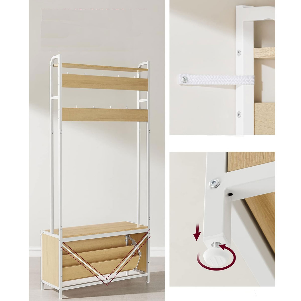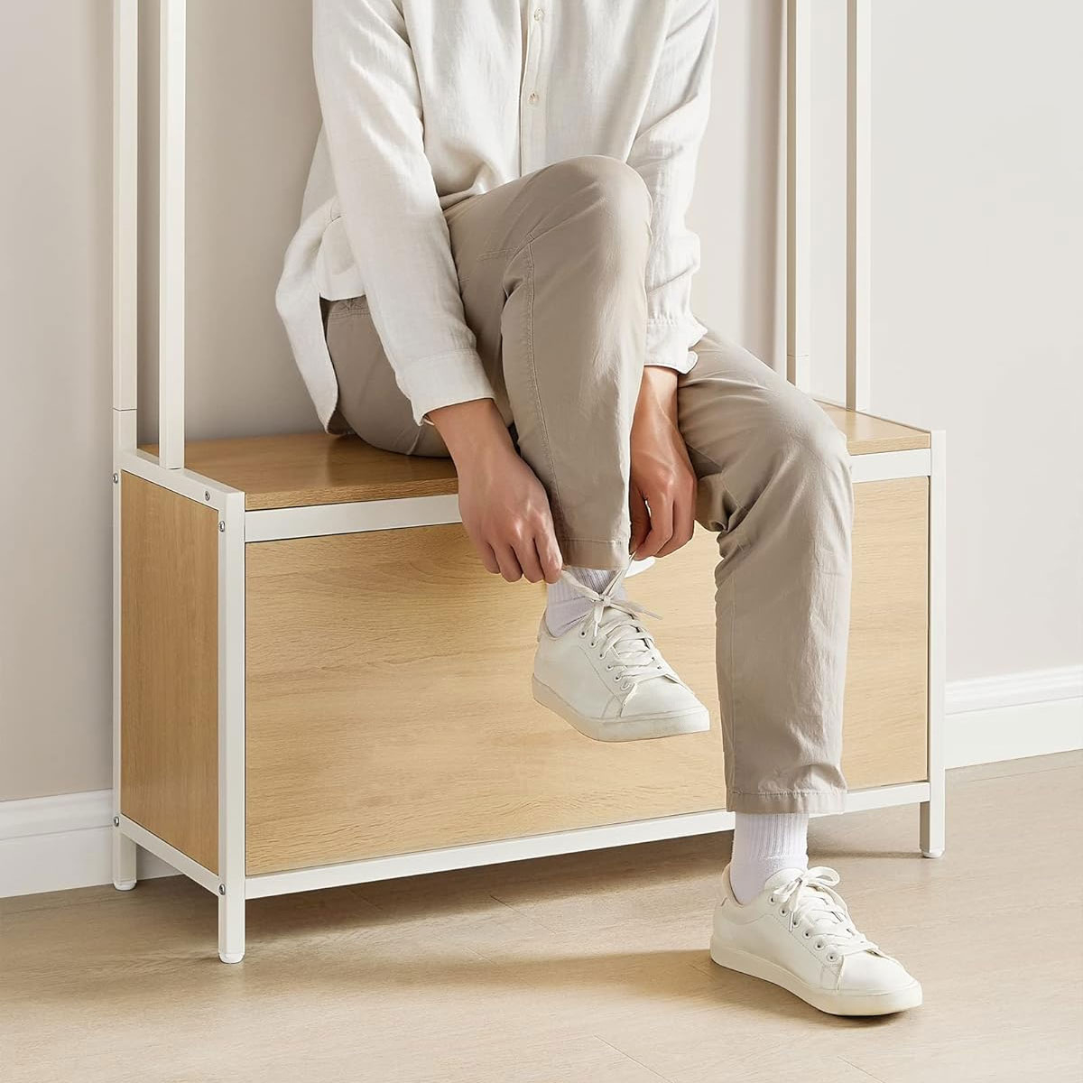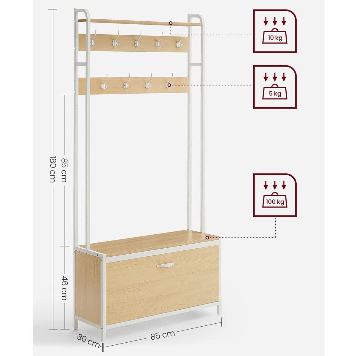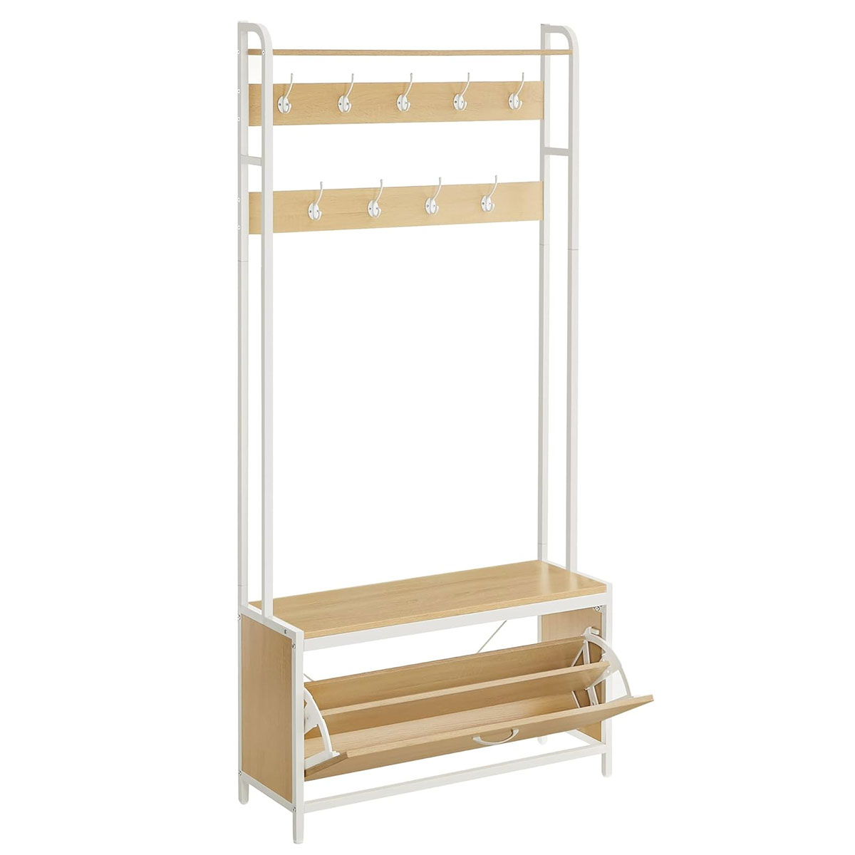 Έπιπλο εισόδου - πορτ μαντώ σε λευκό-μπεζ χρώμα, με παπουτσοθήκη και μοντέρνο σχεδιασμό από την εταιρεία Vasagle. Διαθέτει γαντζάκια για να κρεμάτε τα παλτό και τα ρούχα σας και χώρο για να κάθεστε και να βάζετε τα παπούτσια σας ή για να ακουμπάτε τα πράγματά σας. Το προϊόν έρχεται αμοντάριστο και συναρμολογείται βάσει οδηγιών.