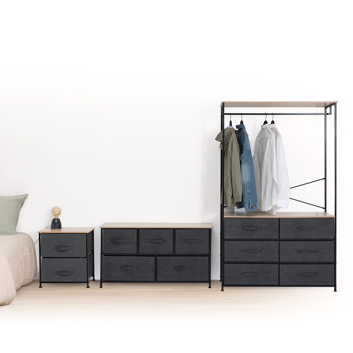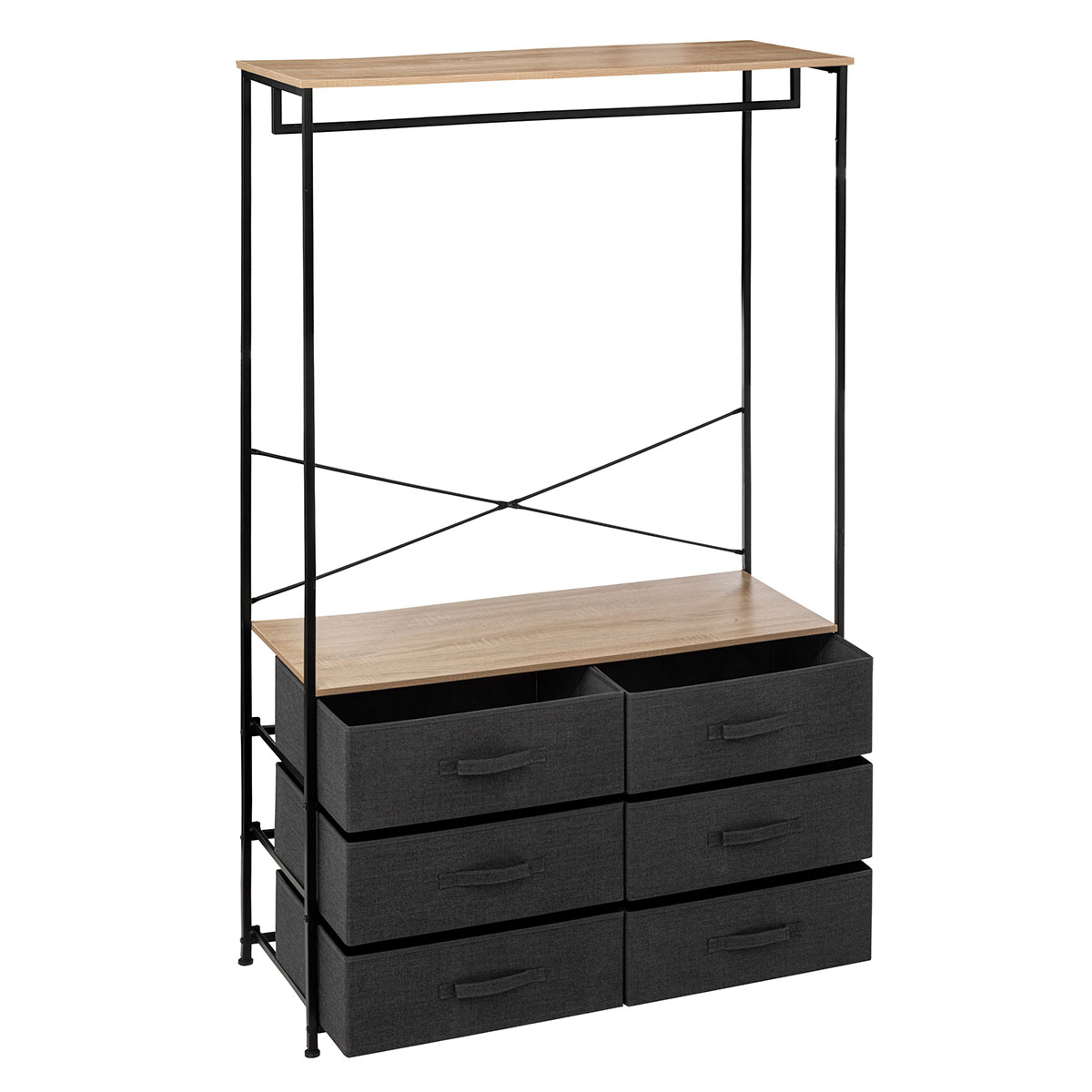 Έπιπλο εισόδου - πορτ μαντώμε συρτάρια για να αποθηκεύσετε τα πράγματά σας. Έχει μαύρο σκελετό και ράφια σε φυσικό χρώμα ξύλου. Διαθέτει ράγα για να κρεμάτε τα ρούχα σας με κρεμάστρες. Συνδυάστε το με τα υπόλοιπα προϊόντα στο ίδιο σετ για ένα ολοκληρωμένο αποτέλεσμα. Το προϊόν έρχεται αμοντάριστο και συναρμολογείται βάσει οδηγιών.