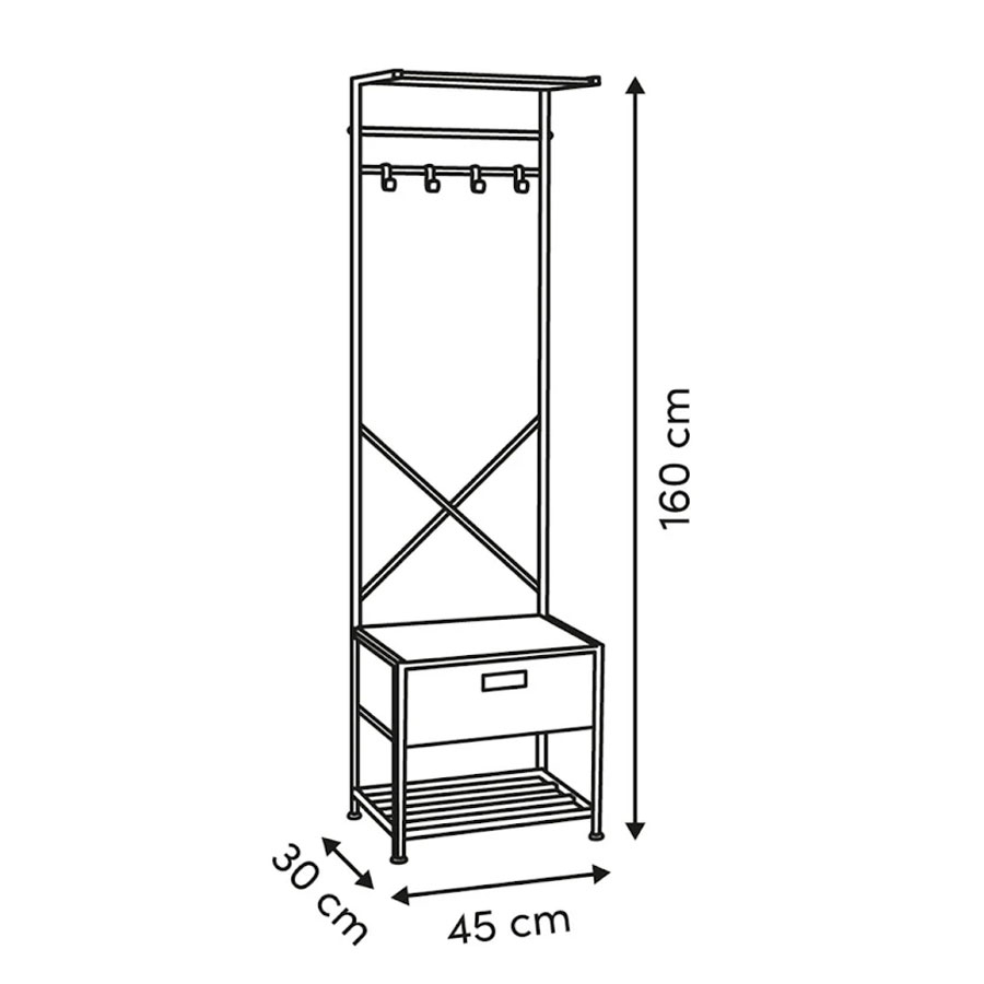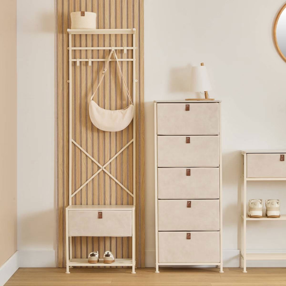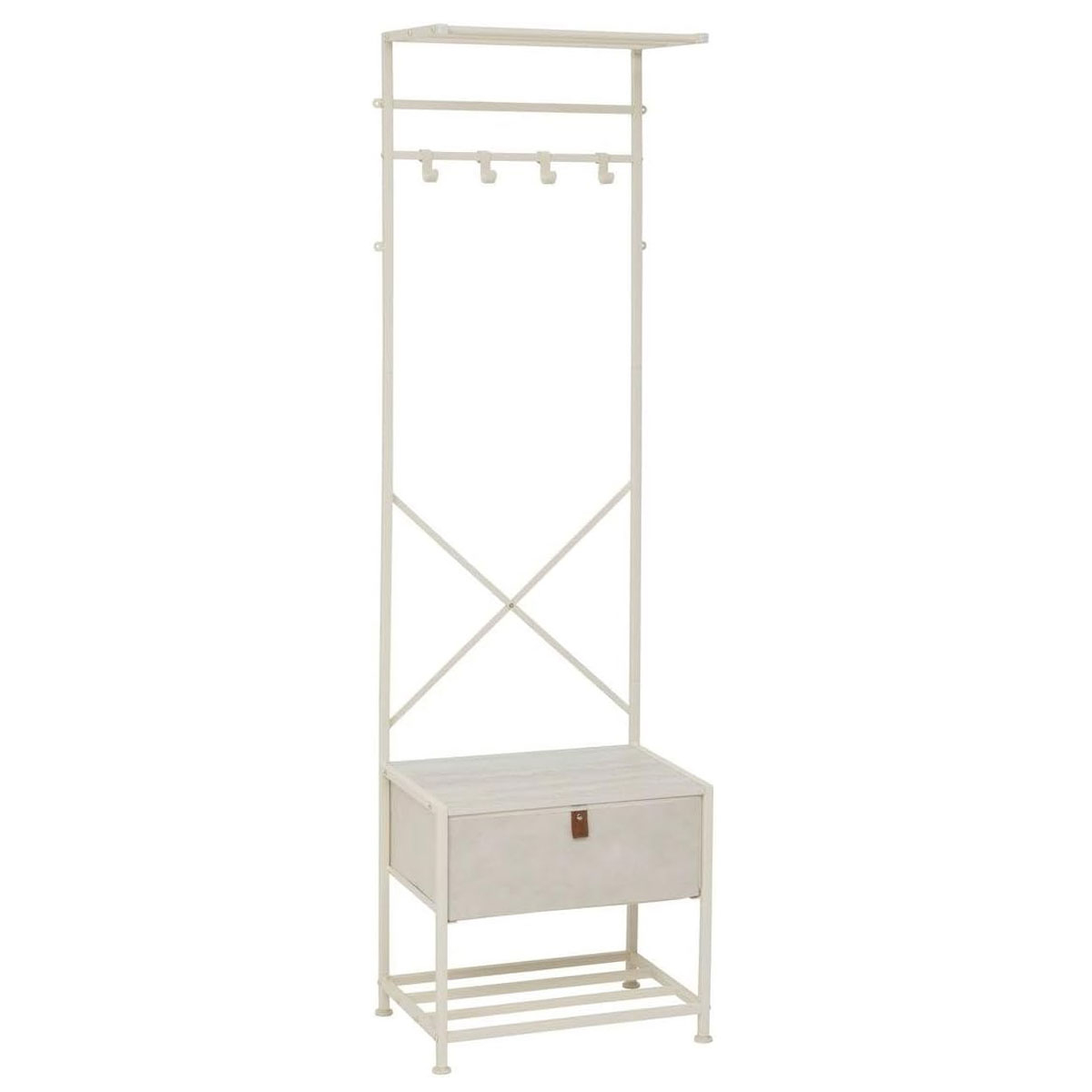 Έπιπλο εισόδου - πορτ μαντώ κατασκευασμένο από μέταλλο σε εκρού χρώμα. Διαθέτει 4 κρεμαστράκια για τα ρούχα σας, 2 ράφια πάνω και κάτω και ένα υφασμάτινο συρτάρι. Επίσης, διαθέτει παπουτσοθήκη στο κάτω μέρος, για έως 4 ζευγάρια παπούτσια. Συνδυάστε το με τα υπόλοιπα προϊόντα στο ίδιο σετ για ένα ολοκληρωμένο αποτέλεσμα. Μέγιστο βάρος αντοχής: 50kg (παπουτσοθήκη 10kg, συρτάρι 5kg, μεσαίο ράφι 11kg, ανά κρεμαστράκι 4 kg, πάνω ράφι 8kg) *Το προϊόν έρχεται αμοντάριστο και συναρμολογείται βάσει οδηγιών.*