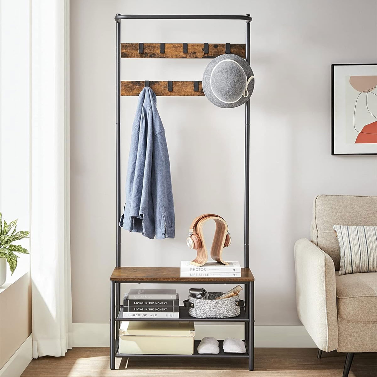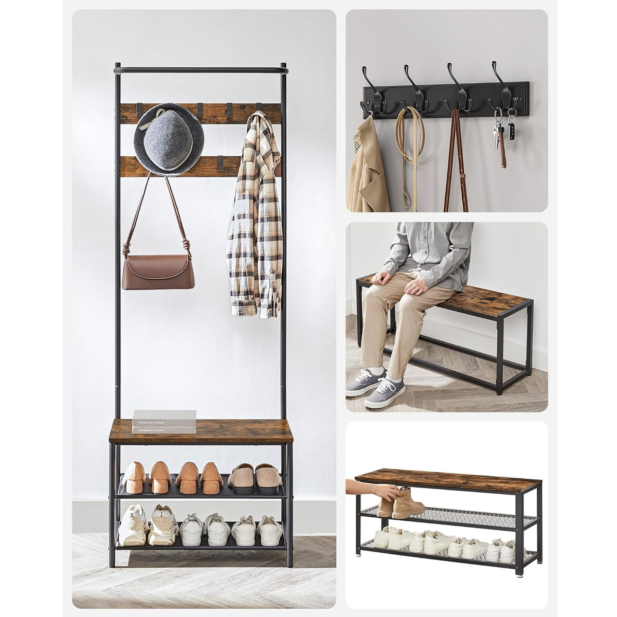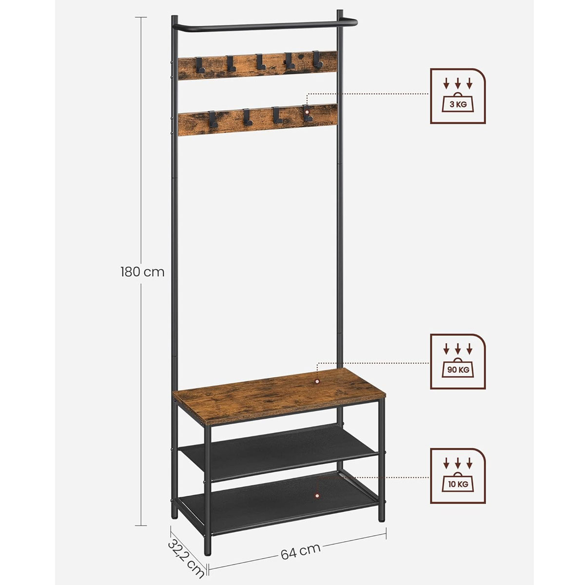 Έπιπλο εισόδου - πορτ μαντώ με μοντέρνο σχεδιασμό από την εταιρεία Vasagle. Έχει μαύρο σκελετό και επιφάνειες καφέ ρουστίκ χρώμα. Διαθέτει χώρο για τα παλτό, τα παπούτσια, τα αξεσουάρ κ.α. για να είναι πάντα τακτοποιημένα και οργανωμένα. Με επιφάνεια που μπορείτε να κάτσετε για να φορέσετε τα παπούτσια σας ή για να ακουμπήσετε τα πράγματα σας. Το προϊόν έρχεται αμοντάριστο και συναρμολογείται βάσει οδηγιών.