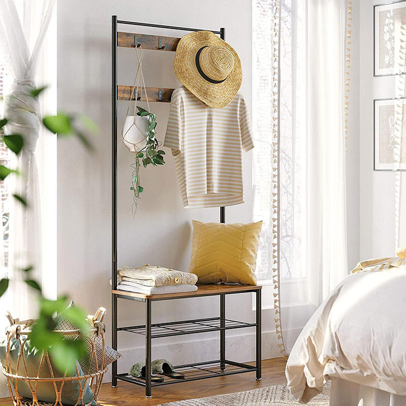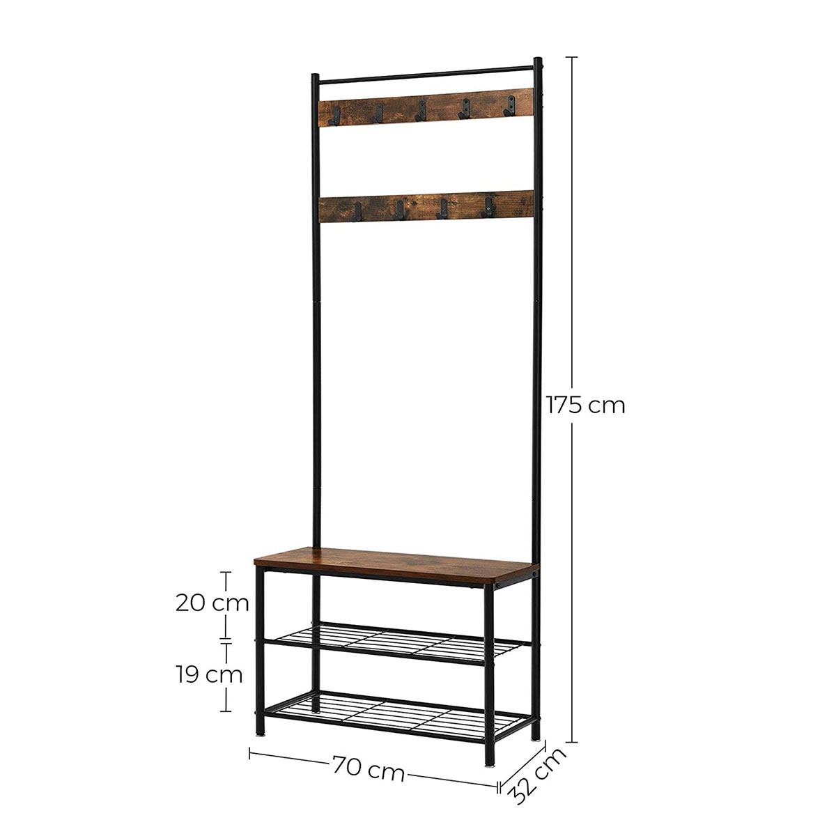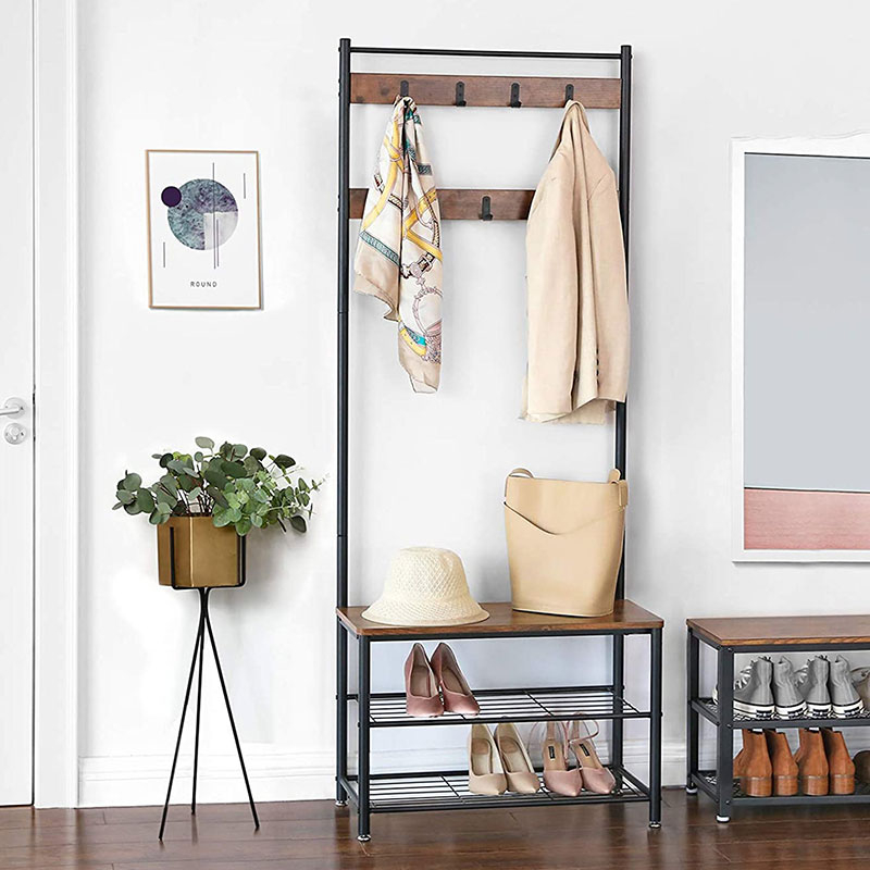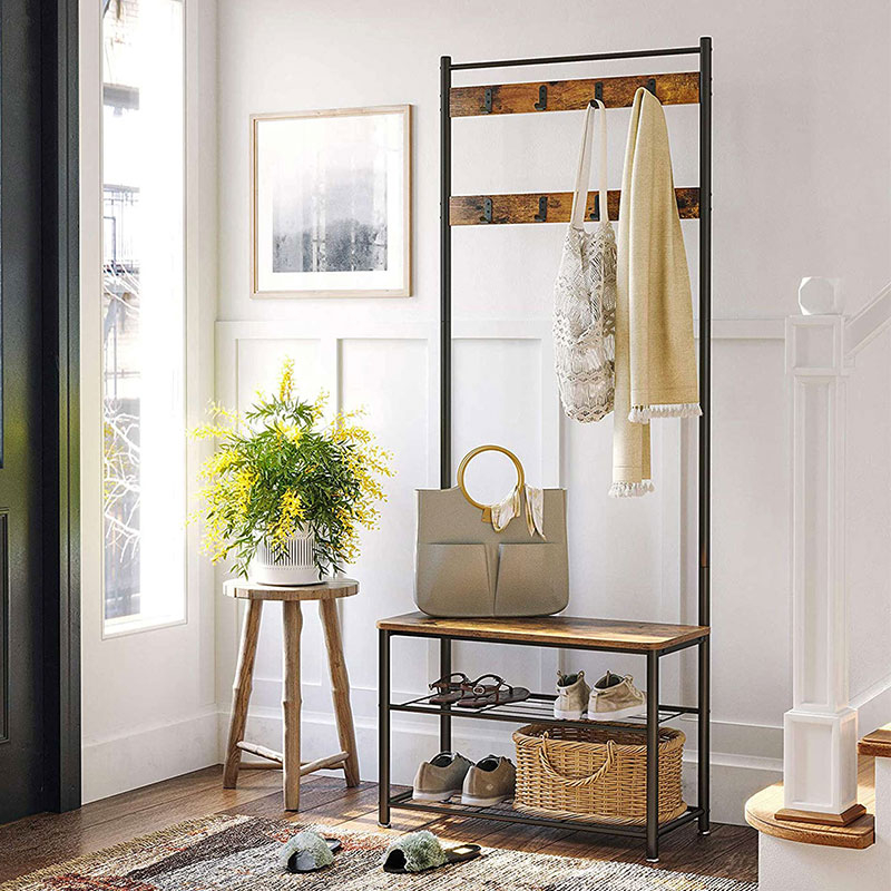 Έπιπλο εισόδου - πορτ μαντώ με μοντέρνο σχεδιασμό από την εταιρεία Vasagleμε μαύρο σκελετό και έπειφάνειες με φυσικό όψη ξύλου. Διαθέτει άγκιστρα για να κρεμάτε τα παλτό, τα κασκόλ κτλ, 2 ράφια στο κάτω μέρος για να βάλετε τα παπούτσια σας και επιφάνεια που μπορείτε να καθίσετε για να τα φορέσετε. Το προϊόν έρχεται αμοντάριστο και συναρμολογείται βάσει οδηγιών.