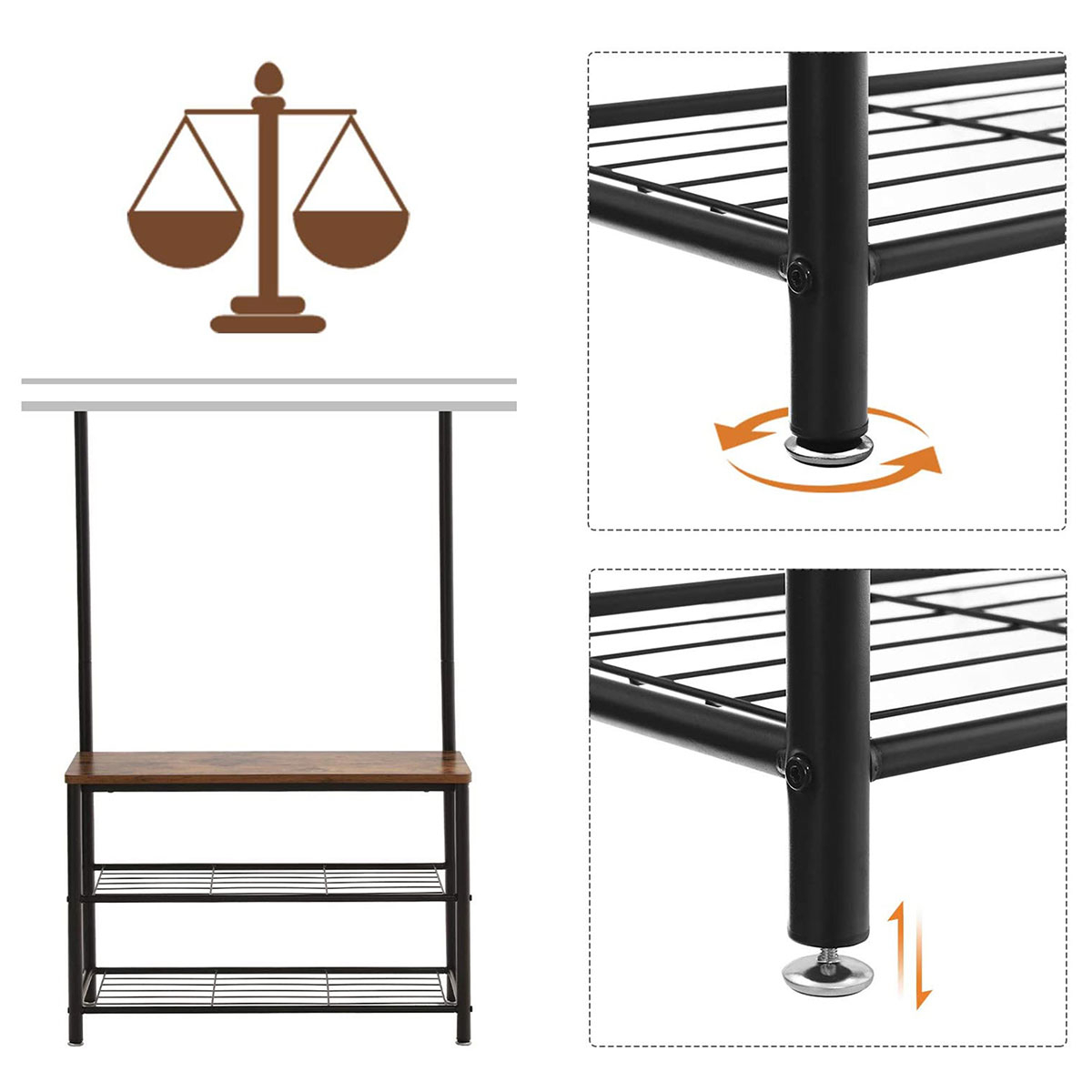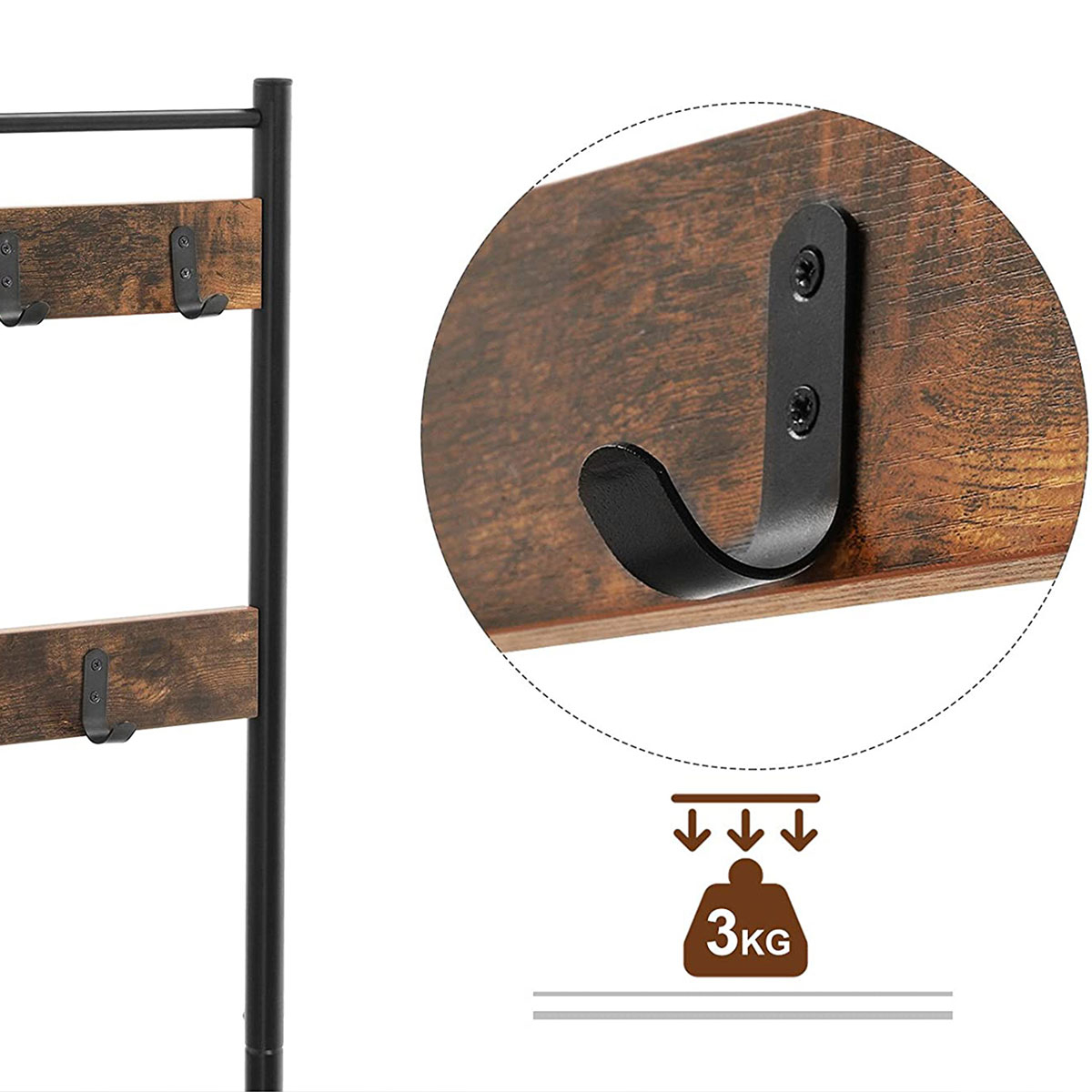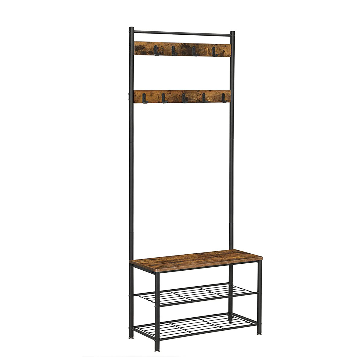 Έπιπλο εισόδου - πορτ μαντώ με μοντέρνο σχεδιασμό από την εταιρεία Vasagleμε μαύρο σκελετό και έπειφάνειες με φυσικό όψη ξύλου. Διαθέτει άγκιστρα για να κρεμάτε τα παλτό, τα κασκόλ κτλ, 2 ράφια στο κάτω μέρος για να βάλετε τα παπούτσια σας και επιφάνεια που μπορείτε να καθίσετε για να τα φορέσετε. Το προϊόν έρχεται αμοντάριστο και συναρμολογείται βάσει οδηγιών.