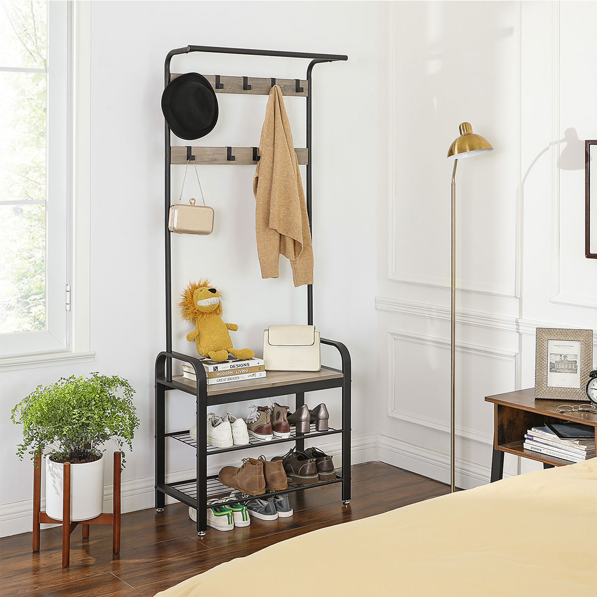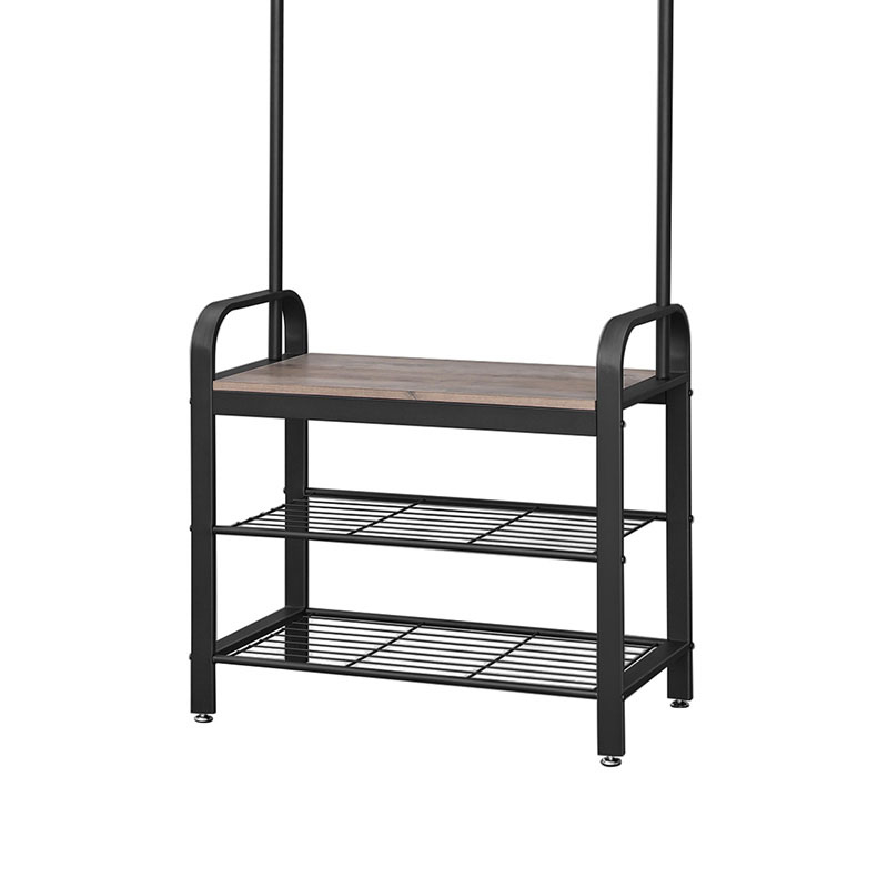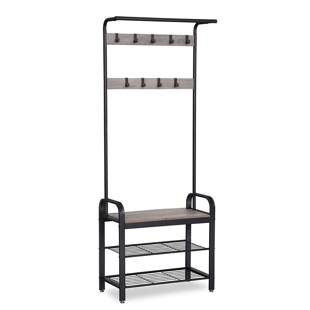 Έπιπλο εισόδου - πορτ μαντώ σε μπεζ-μαύρο χρώμα και vintage σχεδιασμό από την εταιρεία Vasagle. Διαθέτει γάντζους για να κρεμάτε ρούχα ή αξεσουάρ, ράφια που μπορούν να χρησιμοποιηθούν ως παπουτσοθήκη και ξύλινη επιφάνεια μπορεί να χρησιμοποιηθεί και ως χώρος αντικειμένων αλλά και ως κάθισμα για να κάθεστε όταν βάζετε ή βγάζετε τα παπούτσια σας. Το προϊόν έρχεται αμοντάριστο και συναρμολογείται βάσει οδηγιών.