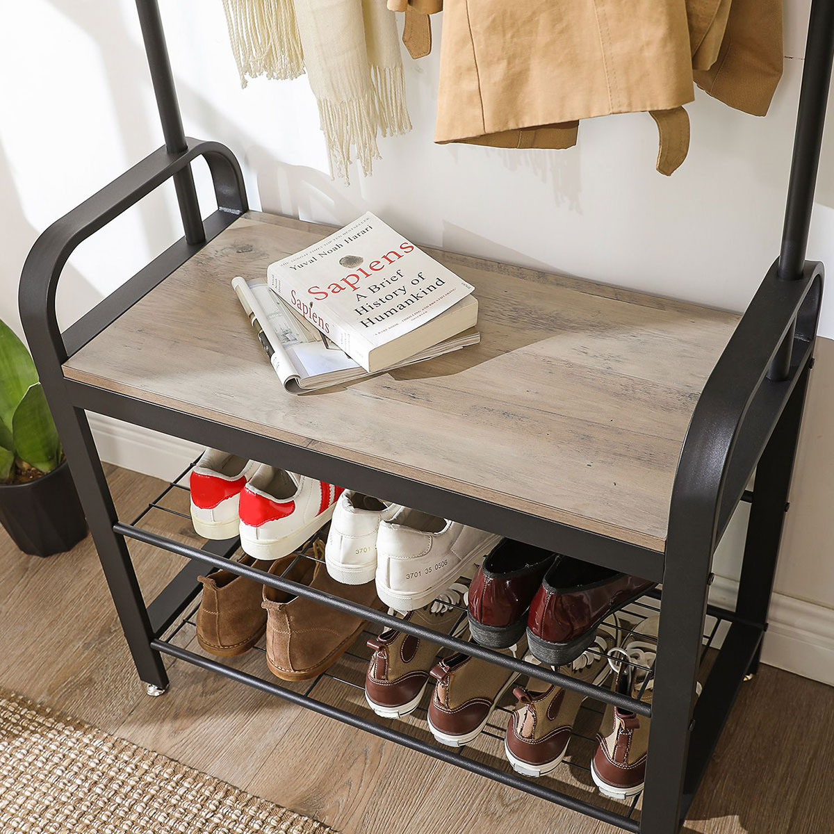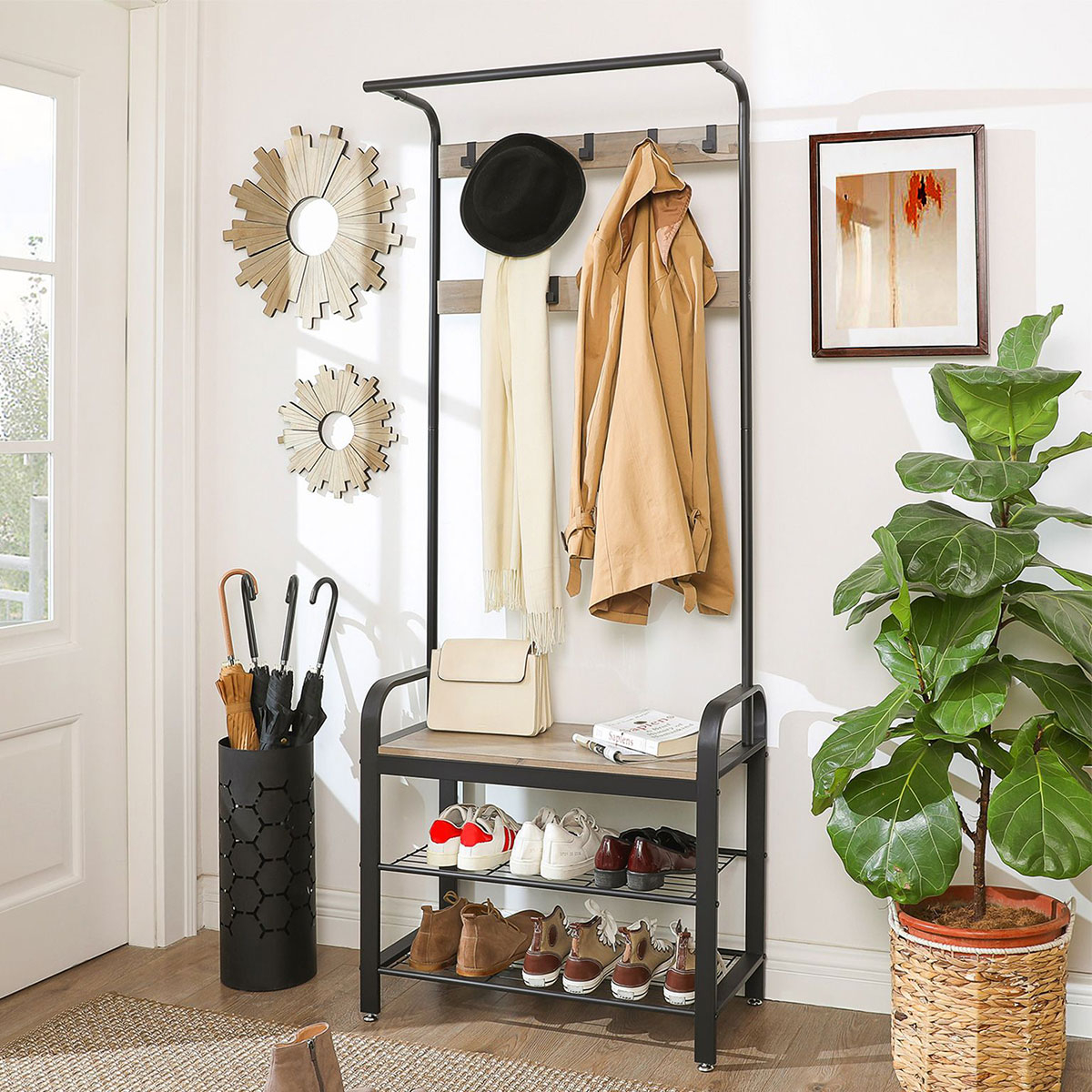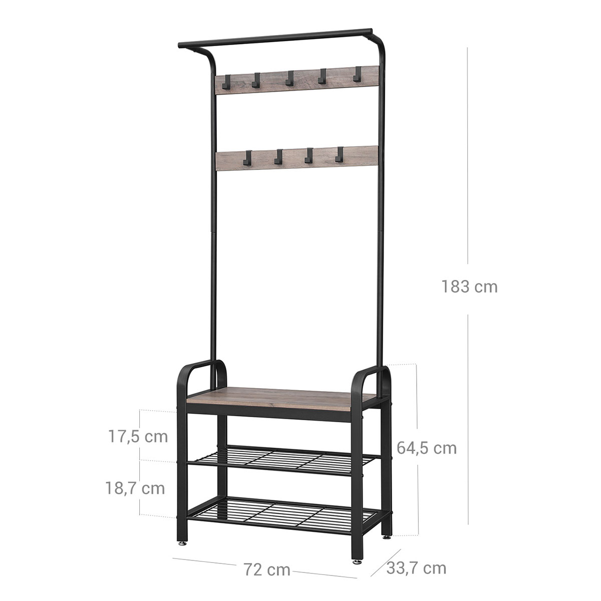 Έπιπλο εισόδου - πορτ μαντώ σε μπεζ-μαύρο χρώμα και vintage σχεδιασμό από την εταιρεία Vasagle. Διαθέτει γάντζους για να κρεμάτε ρούχα ή αξεσουάρ, ράφια που μπορούν να χρησιμοποιηθούν ως παπουτσοθήκη και ξύλινη επιφάνεια μπορεί να χρησιμοποιηθεί και ως χώρος αντικειμένων αλλά και ως κάθισμα για να κάθεστε όταν βάζετε ή βγάζετε τα παπούτσια σας. Το προϊόν έρχεται αμοντάριστο και συναρμολογείται βάσει οδηγιών.