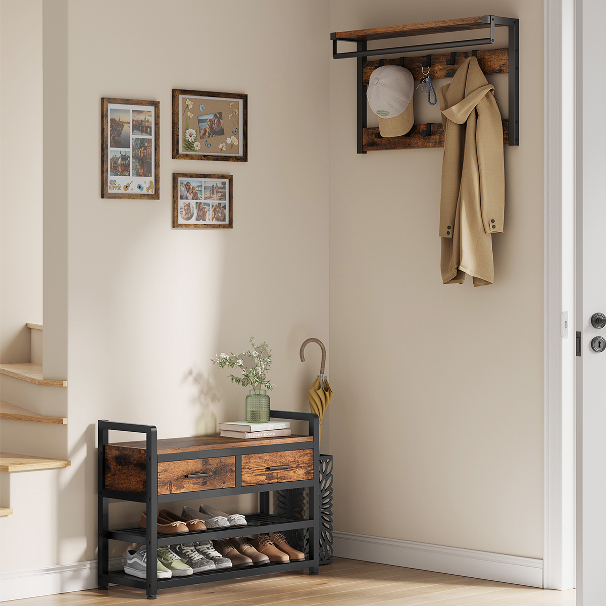 Έπιπλο εισόδου - πορτ μαντώ με μοντέρνο σχεδιασμό από την εταιρεία Vasagle. Είναι κατασκευασμένο από μοριοσανίδα σε καφέ ρουστίκ χρώμα και έχει μαύρο μεταλλικό σκελετό. Διαθέτει 10 γάντζους για να κρεμάτε ρούχα ή αξεσουάρ. Στο κάτω μέρος έχει 2 συρτάρια για να αποθηκεύσετε τα πράγματα σας και 2 ράφια για παπούτσια που μπορούν να χωρέσουν έως 8 ζευγάρια. Η ξύλινη επιφάνεια μπορεί να χρησιμοποιηθεί και ως χώρος για να ακουμπάτε αντικείμενα αλλά και ως κάθισμα για όταν βάζετε ή βγάζετε τα παπούτσια σας. Στο πάνω μέρος διαθέτει ραφάκι και ράγα για να κρεμάτε κρεμάστρες με τα παλτό σας. Διαθέτει τάπες για να μην φθείρει το πάτωμα. Μέγιστο βάρος αντοχής καθίσματος: 100kg. Μέγιστο βάρος αντοχής ανά γάντζο: 5kg. Μέγιστο βάρος αντοχής ανά ράφι: 20kg. Μέγιστο βάρος αντοχής επάνω ραφιού: 5 kg. Μέγιστο βάρος αντοχής ράγας: 22kg. Συνδυάστε το με τα υπόλοιπα είδη της ίδιας σειράς για ένα ολοκληρωμένο αποτέλεσμα στο χώρο σας. *Το προϊόν έρχεται αμοντάριστο και συναρμολογείται βάσει οδηγιών.*