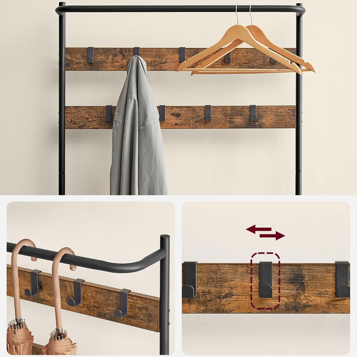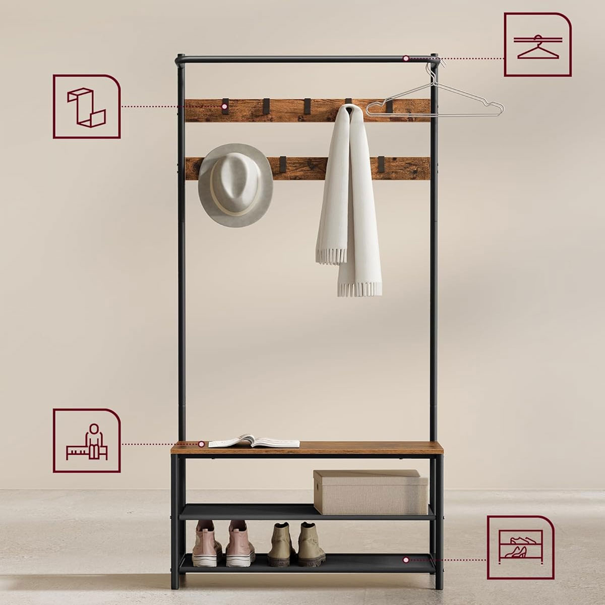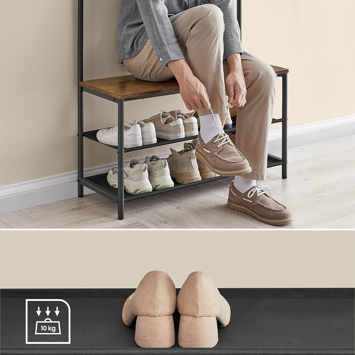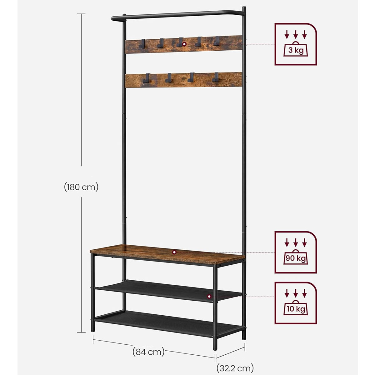 Έπιπλο εισόδου - πορτ μαντώ με μοντέρνο σχεδιασμό από την εταιρεία Vasagle. Έχει μαύρο σκελετό και επιφάνειες καφέ ρουστίκ χρώμα. Διαθέτει χώρο για τα παλτό, τα παπούτσια, τα αξεσουάρ κ.α. για να είναι πάντα τακτοποιημένα και οργανωμένα. Με επιφάνεια που μπορείτε να κάτσετε για να φορέσετε τα παπούτσια σας ή για να ακουμπήσετε τα πράγματα σας. Το προϊόν έρχεται αμοντάριστο και συναρμολογείται βάσει οδηγιών.