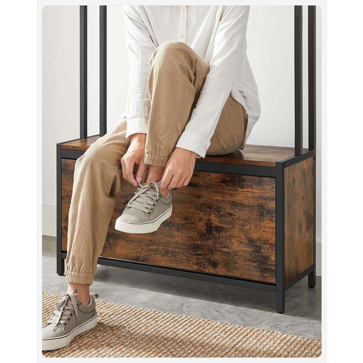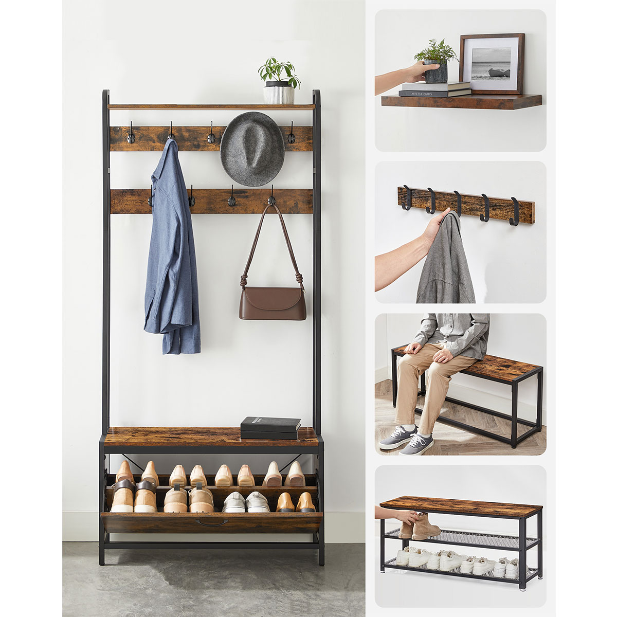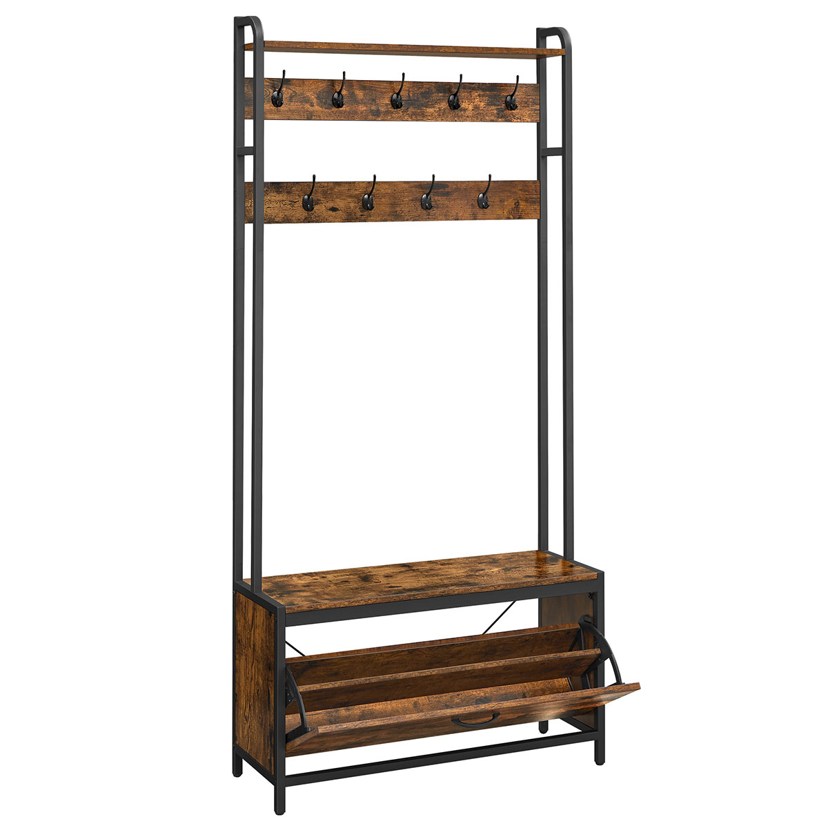 Έπιπλο εισόδου - πορτ μαντώ με μοντέρνο σχεδιασμό σε καφέ ρουστίκ χρώμα και μαύρο σκελετό από την εταιρεία Vasagle. Διαθέτει γάντζους για να κρεμάτε ρούχα ή αξεσουάρ, ανακλινόμενη παπουτσοθήκη, ξύλινη επιφάνεια για να ακουμπάτε αντικείμενα αλλά για να βάζετε ή βγάζετε τα παπούτσια σας μία ακόμη επιφάνεια στο πάνω μέρος. Το προϊόν έρχεται αμοντάριστο και συναρμολογείται βάσει οδηγιών.