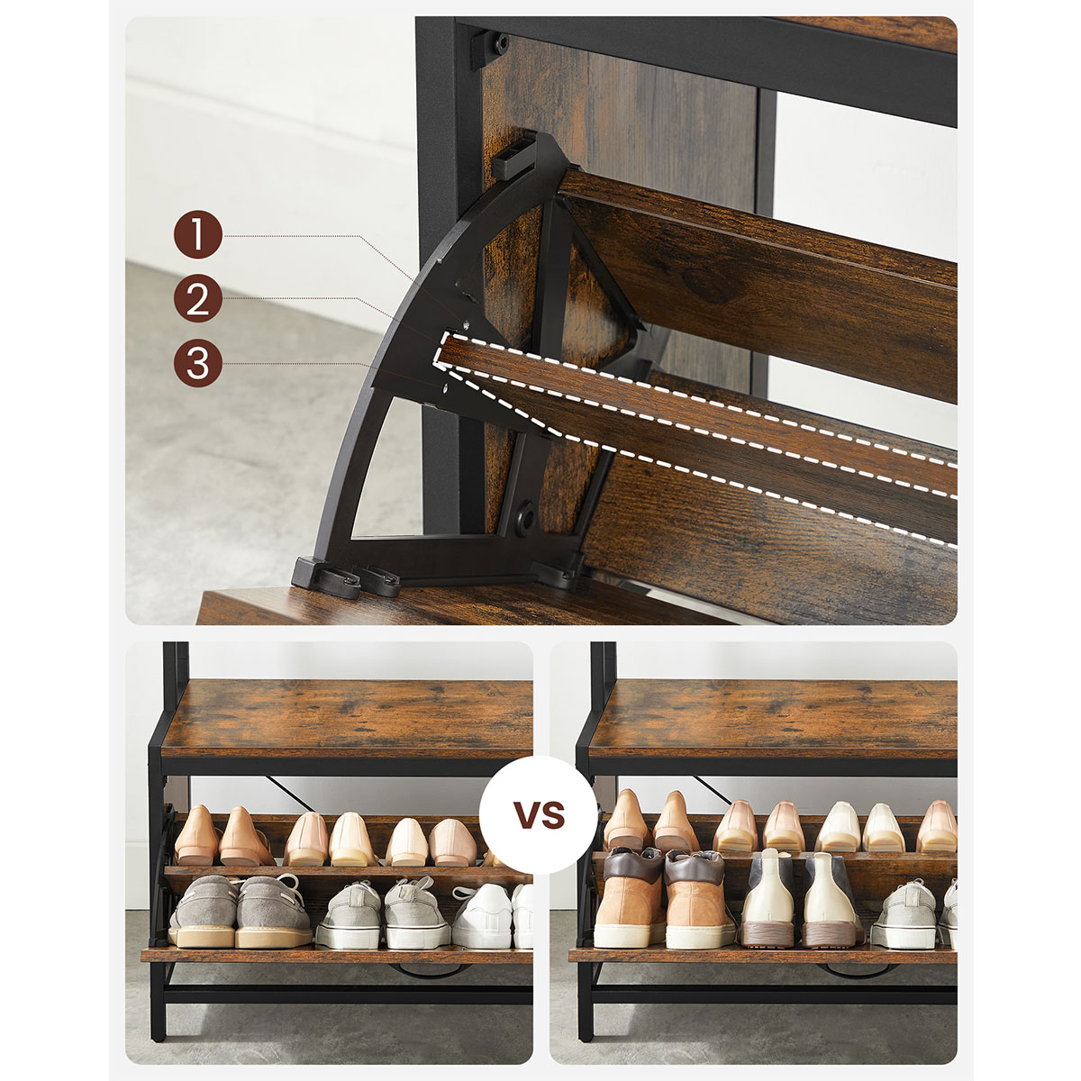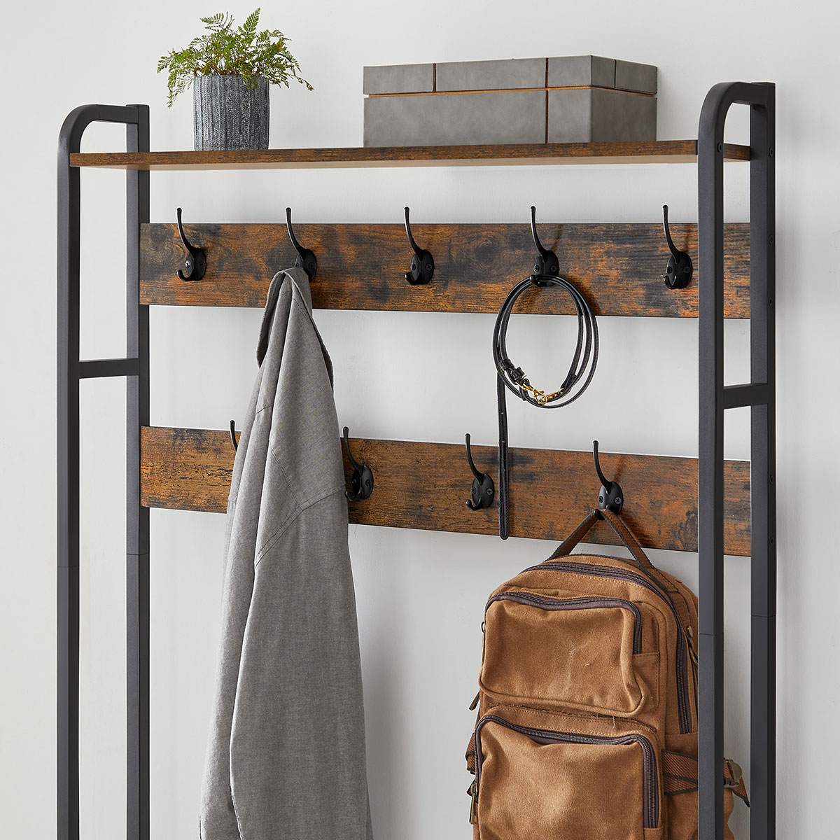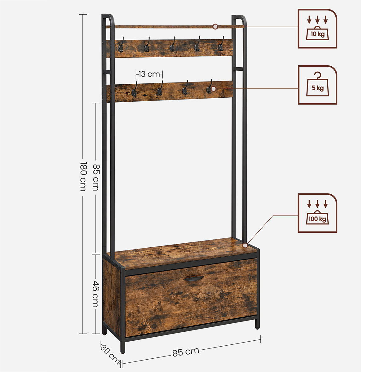 Έπιπλο εισόδου - πορτ μαντώ με μοντέρνο σχεδιασμό σε καφέ ρουστίκ χρώμα και μαύρο σκελετό από την εταιρεία Vasagle. Διαθέτει γάντζους για να κρεμάτε ρούχα ή αξεσουάρ, ανακλινόμενη παπουτσοθήκη, ξύλινη επιφάνεια για να ακουμπάτε αντικείμενα αλλά για να βάζετε ή βγάζετε τα παπούτσια σας μία ακόμη επιφάνεια στο πάνω μέρος. Το προϊόν έρχεται αμοντάριστο και συναρμολογείται βάσει οδηγιών.