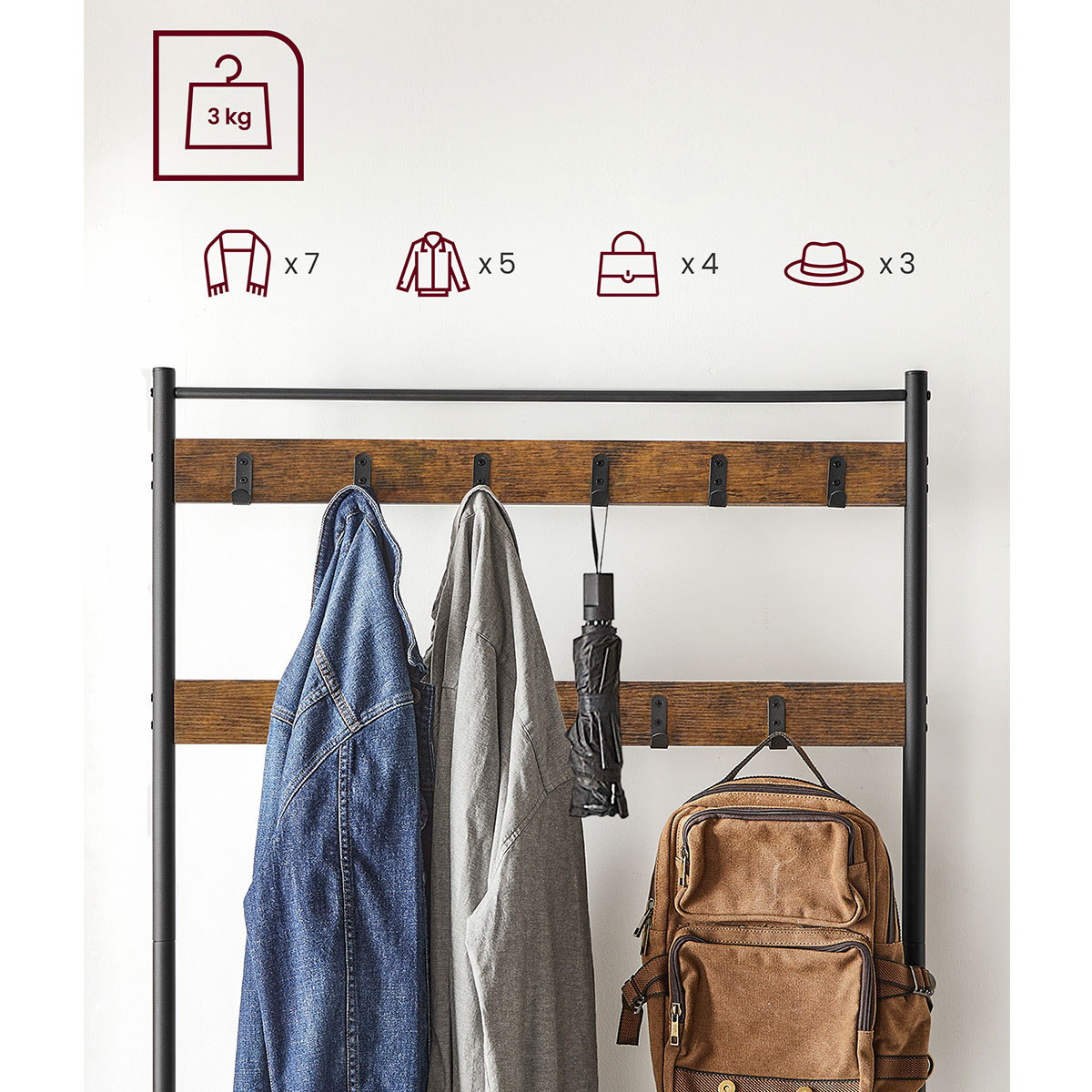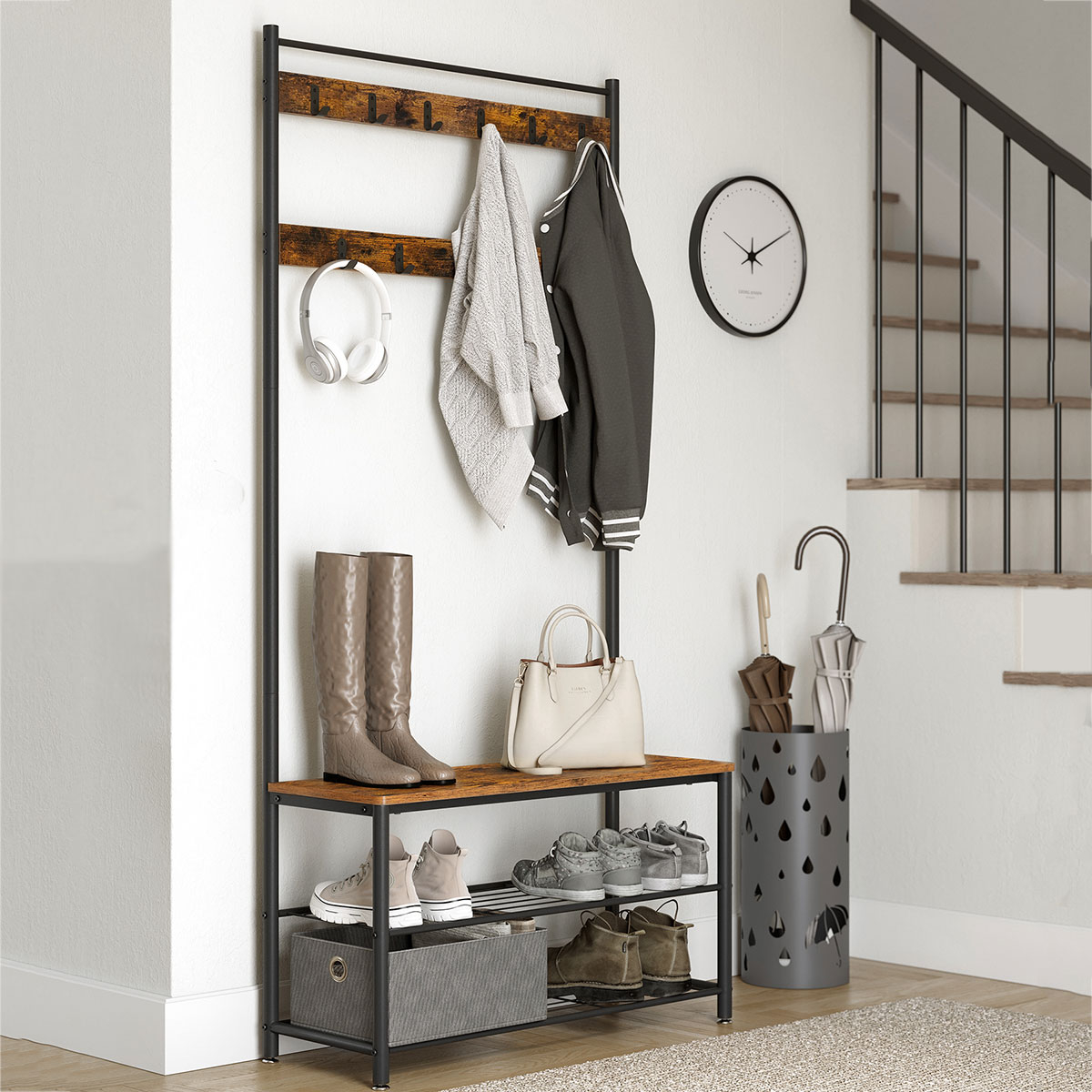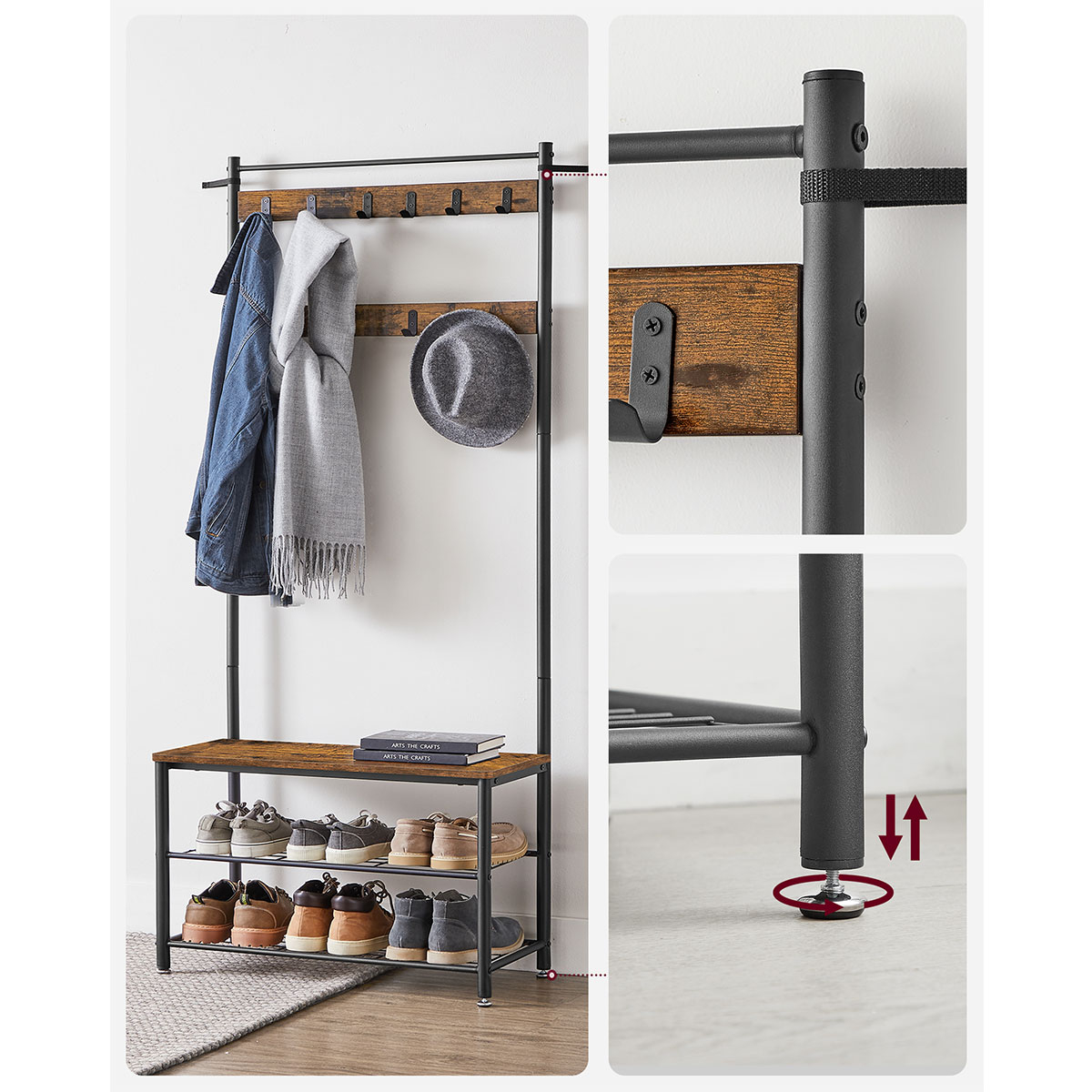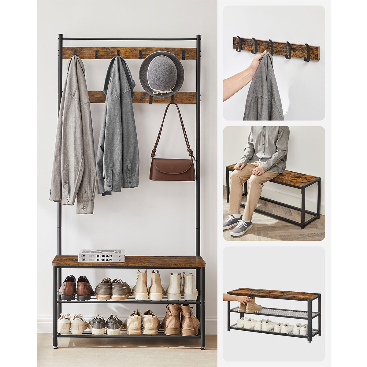 Έπιπλο εισόδου - πορτ μαντώ με μοντέρνο σχεδιασμό από την εταιρεία Vasagle. Έχει μαύρο σκελετό και επιφάνειες σε φυσικό χρώμα ξύλου. Διαθέτει γάντζους, μεταλλικά ράφια που μπορούν να χρησιμοποιηθούν ως παπουτσοθήκη, επιφάνεια που μπορεί να χρησιμοποιηθεί για να ακουμπάτε αντικείμενα αλλά και ως κάθισμα για όταν βάζετε ή βγάζετε τα παπούτσια σας. Ιδανικό για να διακοσμήσει και να τακτοποιήσει την είσοδο του σπιτιού σας. Το προϊόν έρχεται αμοντάριστο και συναρμολογείται βάσει οδηγιών.