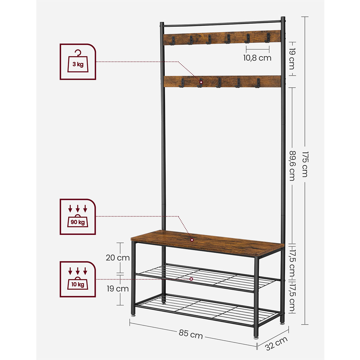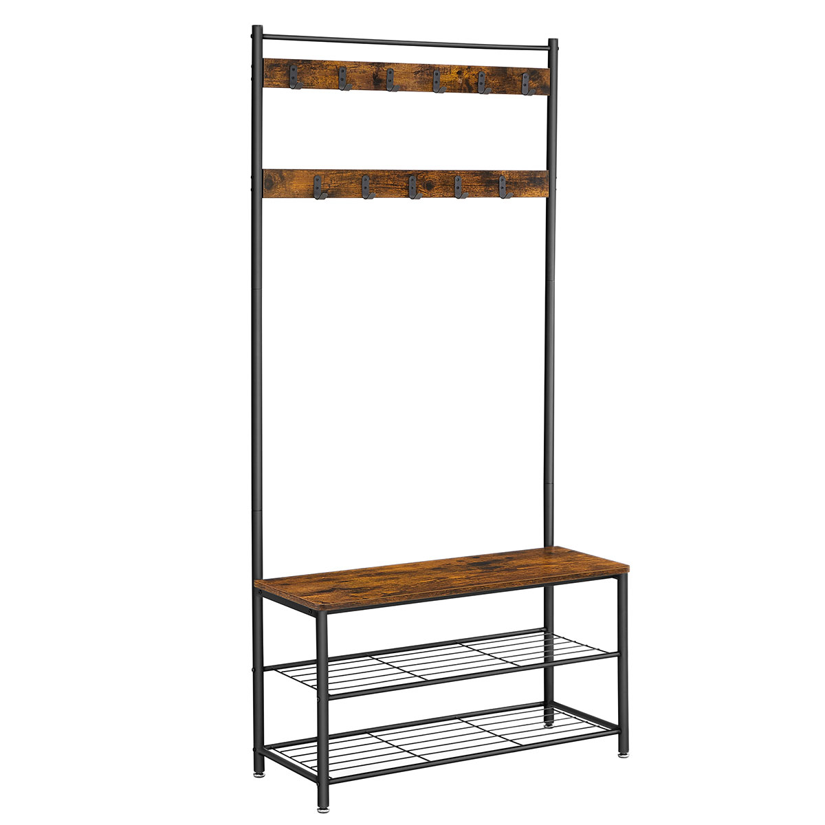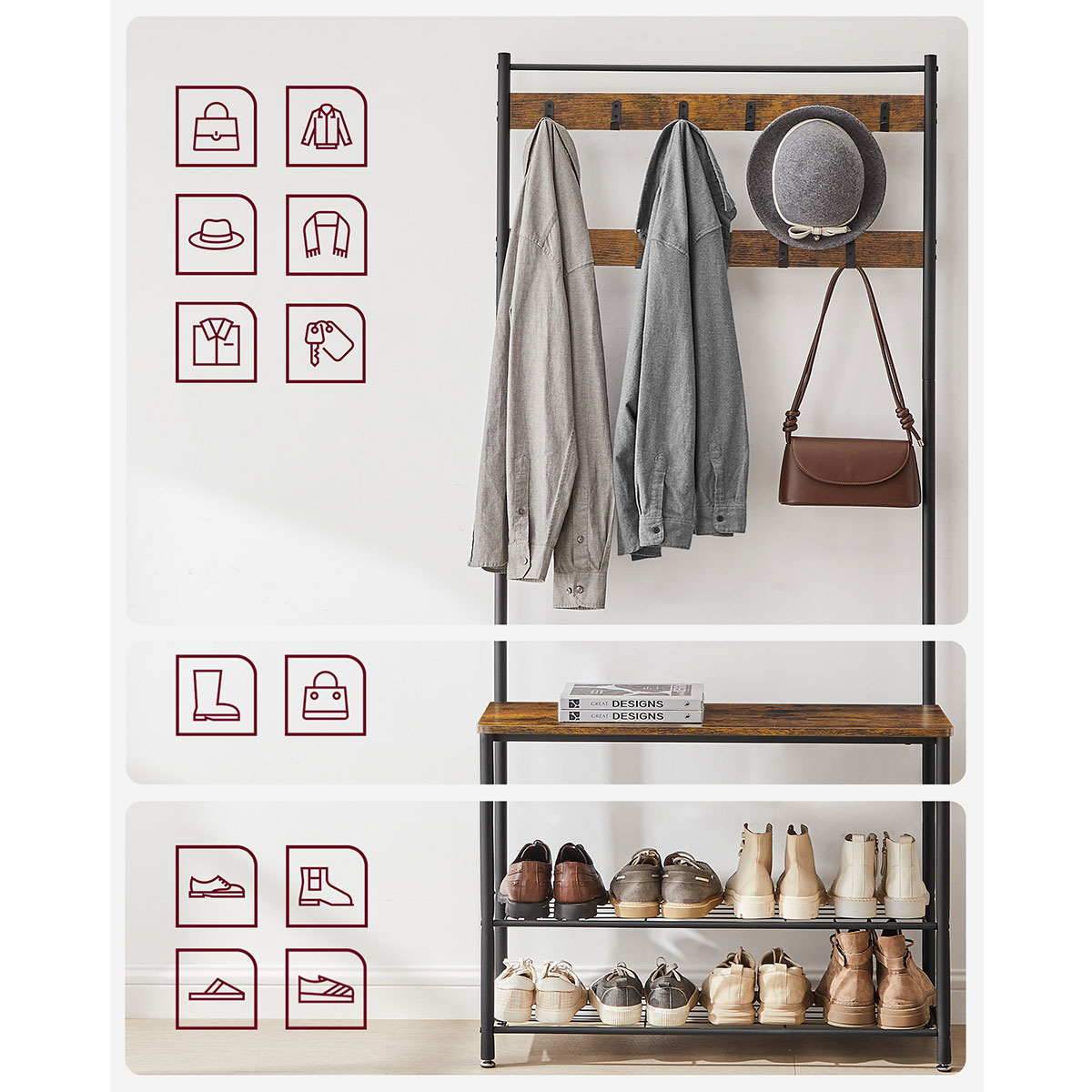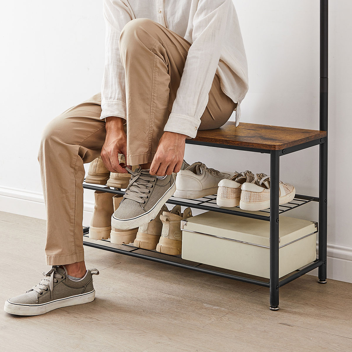 Έπιπλο εισόδου - πορτ μαντώ με μοντέρνο σχεδιασμό από την εταιρεία Vasagle. Έχει μαύρο σκελετό και επιφάνειες σε φυσικό χρώμα ξύλου. Διαθέτει γάντζους, μεταλλικά ράφια που μπορούν να χρησιμοποιηθούν ως παπουτσοθήκη, επιφάνεια που μπορεί να χρησιμοποιηθεί για να ακουμπάτε αντικείμενα αλλά και ως κάθισμα για όταν βάζετε ή βγάζετε τα παπούτσια σας. Ιδανικό για να διακοσμήσει και να τακτοποιήσει την είσοδο του σπιτιού σας. Το προϊόν έρχεται αμοντάριστο και συναρμολογείται βάσει οδηγιών.