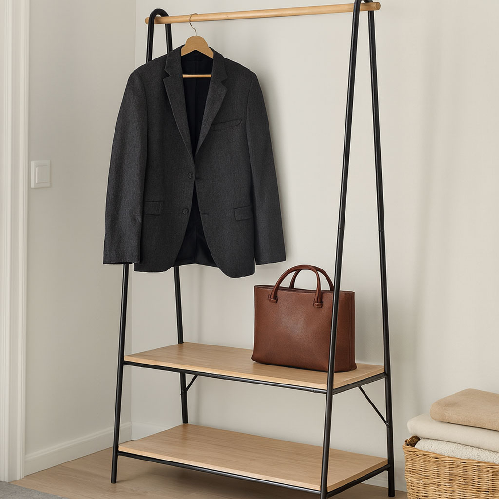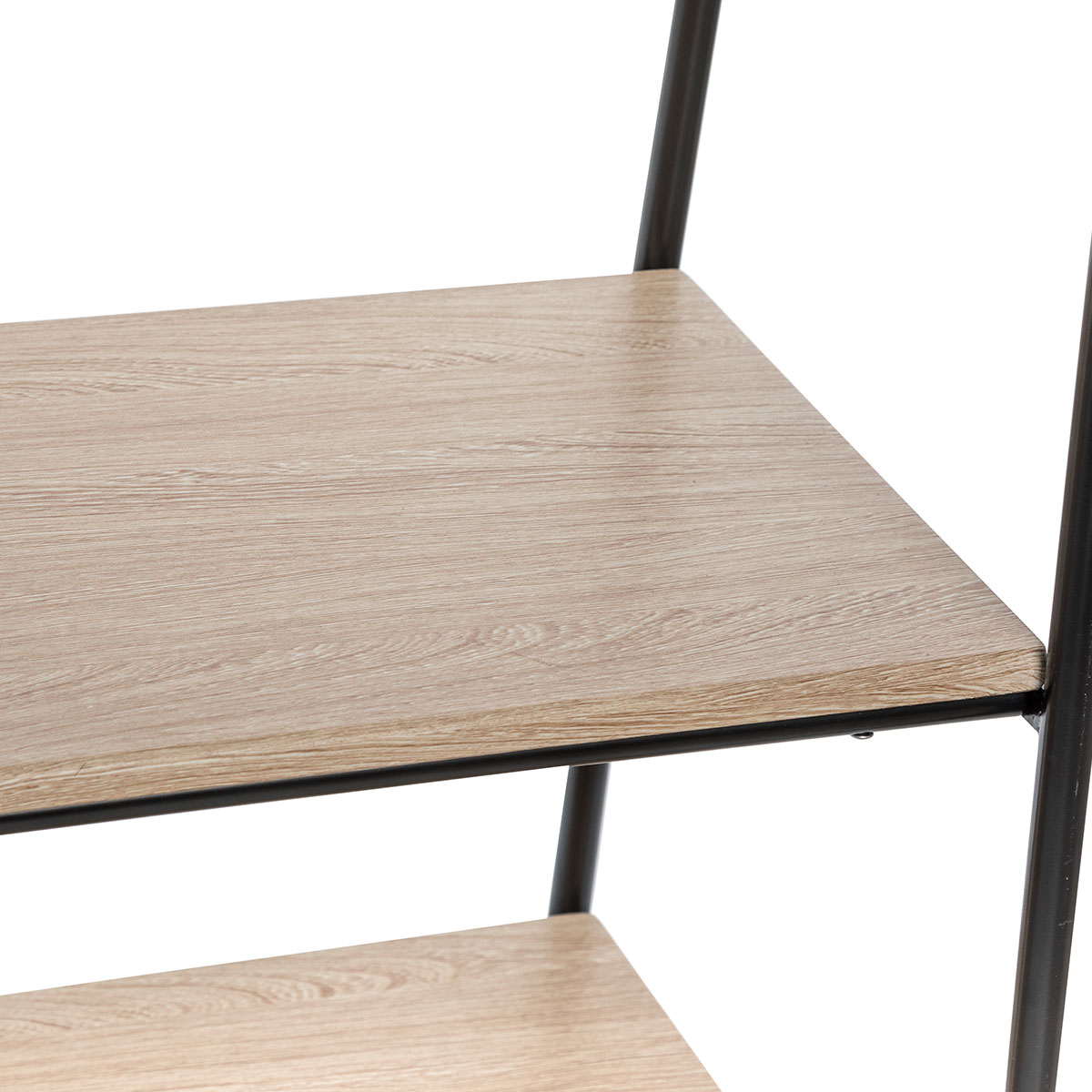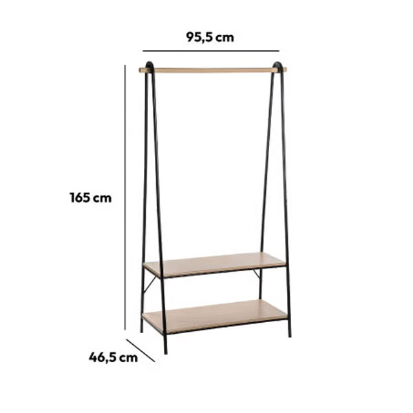 Έπιπλο εισόδου με μαύρο σκελετό και επιφάνειες σε φυσικό χρώμα ξύλου. Διαθέτει ράγα για κρεμάστρες και ράφια για να ακουμπάτε τα παπούτσια, τις τσάντες ή ότι άλλο θέλετε. Το προϊόν έρχεται αμοντάριστο και συναρμολογείται βάσει οδηγιών.