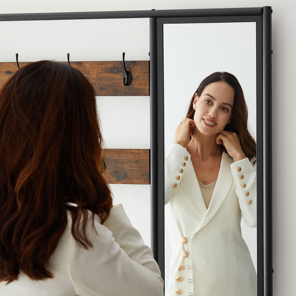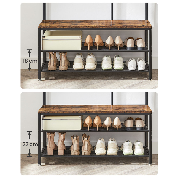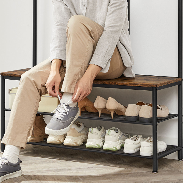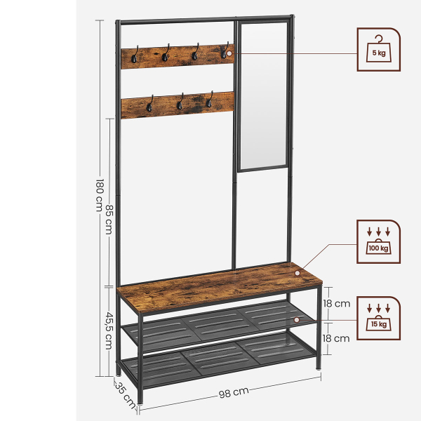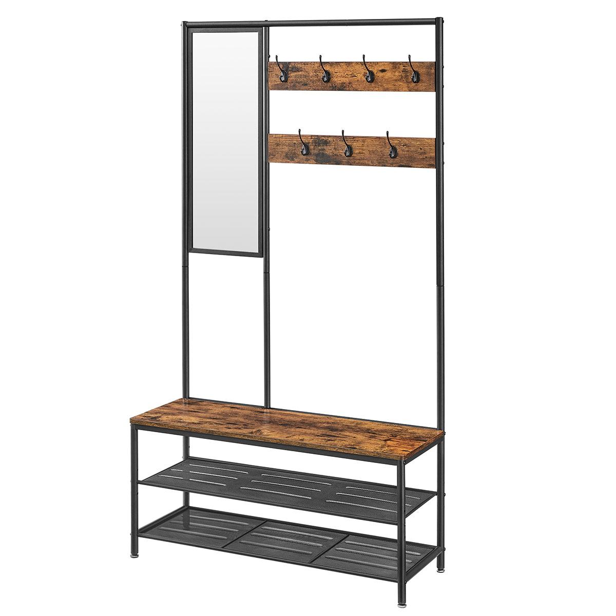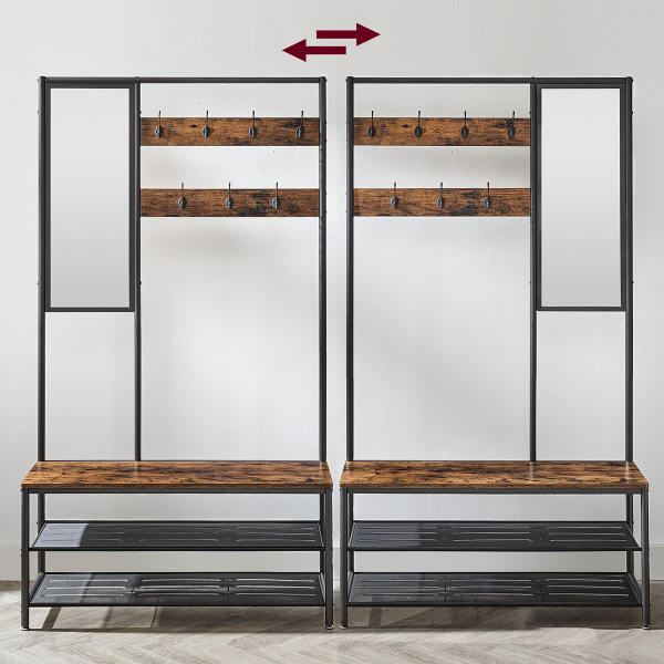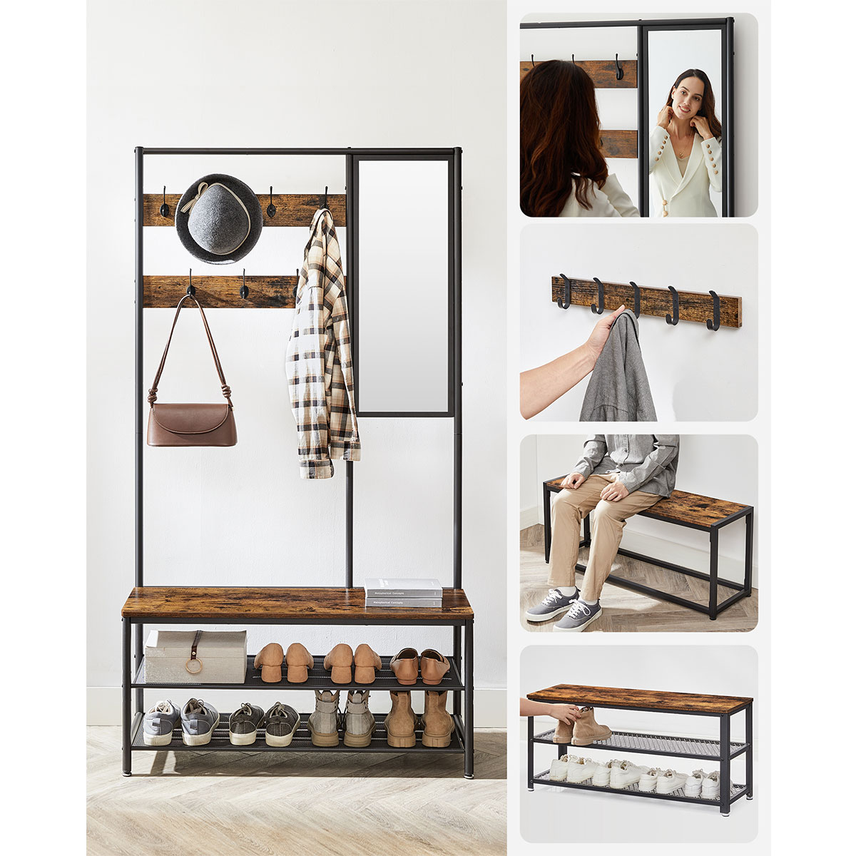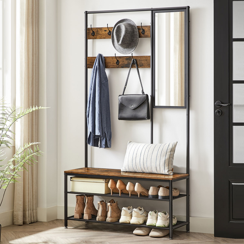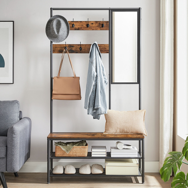 Έπιπλο εισόδου - πορτ μαντώ με μοντέρνο σχεδιασμό από την εταιρεία Vasagle. Έχει μαύρο σκελετό και επιφάνειες σε φυσικό χρώμα ξύλου. Διαθέτει καθρέφτη, γάντζους, ράφια που μπορούν να χρησιμοποιηθούν ως παπουτσοθήκη, επιφάνεια που μπορεί να χρησιμοποιηθεί για να ακουμπάτε αντικείμενα αλλά και ως κάθισμα για όταν βάζετε ή βγάζετε τα παπούτσια σας. Ιδανικό για να διακοσμήσει και να τακτοποιήσει την είσοδο του σπιτιού σας. Το προϊόν έρχεται αμοντάριστο και συναρμολογείται βάσει οδηγιών.