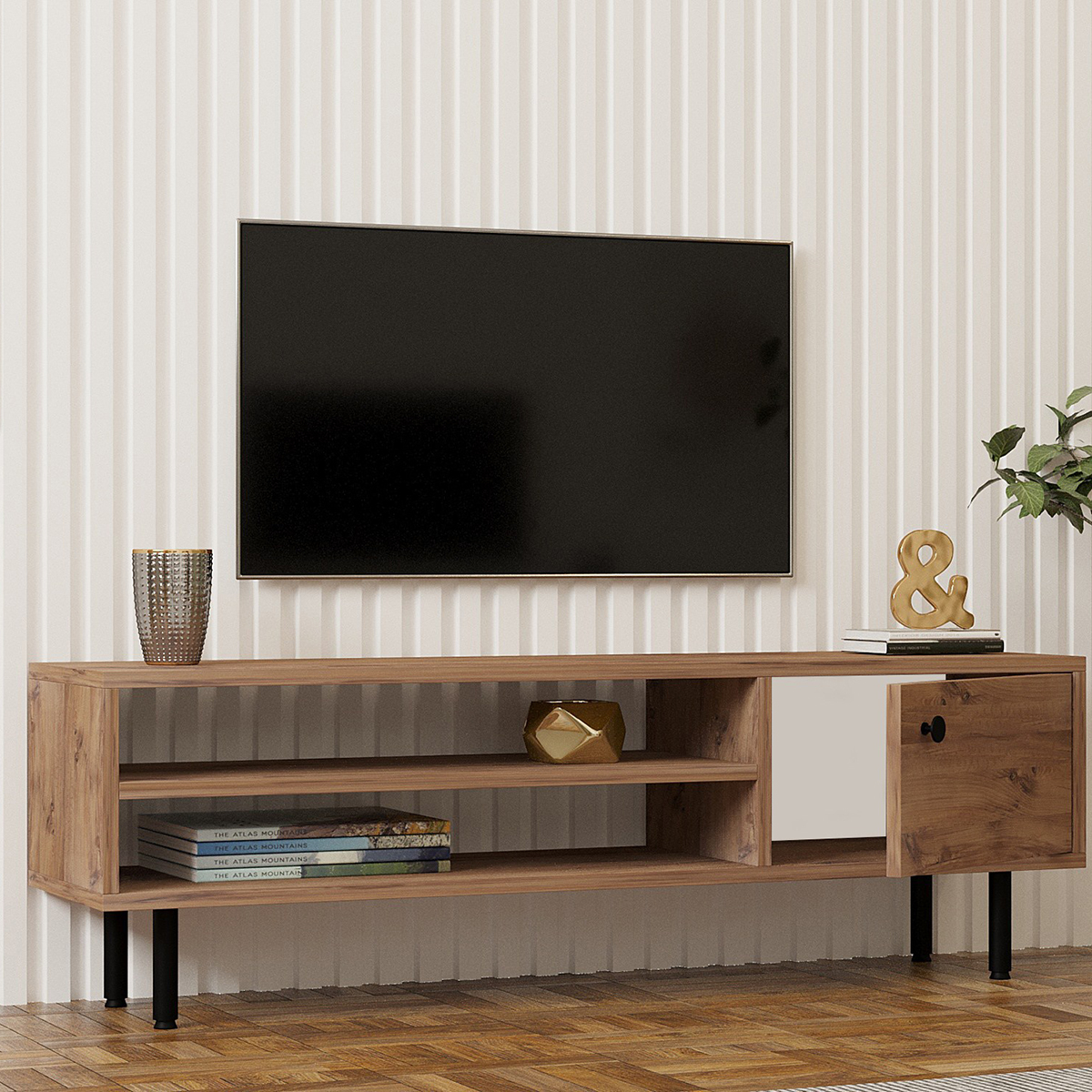 Κονσόλα τηλεόρασης σε φυσική απόχρωση ξύλου με κλασικό σχεδιασμό. Είναι κατασκευασμένη από μοριοσανίδα πάχους 18mm επενδυμένη με μελαμίνη και έχει μεταλλικά μαύρα πόδια. Διαθέτει ντουλάπι και ράφι για επιπλέον αποθηκευτικό χώρο στο σαλόνι σας. Μέγιστο βάρος αντοχής: 20 kg *Το προϊόν έρχεται αμοντάριστο και συναρμολογείται βάσει οδηγιών.*