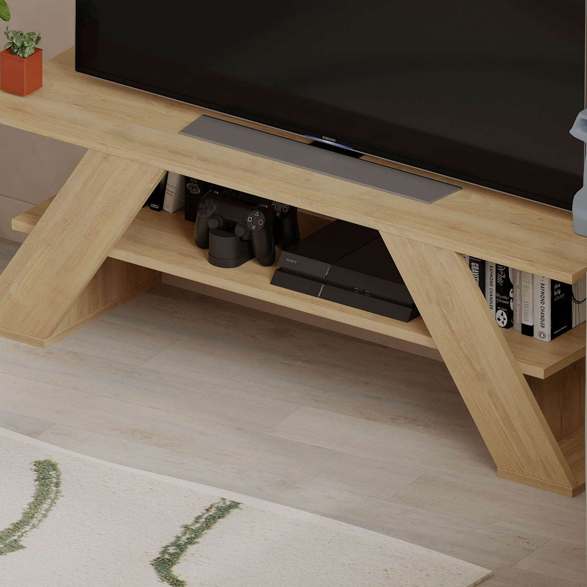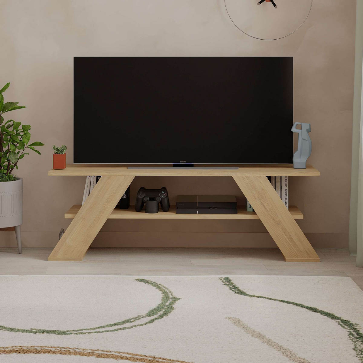 Κονσόλα τηλεόρασης σε απόχρωση δρυός με μοντέρνο σχεδιασμό. Κατασκευασμένη από υψηλής ποιότητας, ανθεκτικά υλικά και με επιπλέον αποθηκευτικό χώρο για κονσόλες, ηλεκτρικές συσκευές ή ότι άλλο επιθυμείτε. Ταιριάζει με τα περισσότερα χρώματα και στυλ διακόσμησης. Το προϊόν έρχεται αμοντάριστο και συναρμολογείται βάσει οδηγιών.