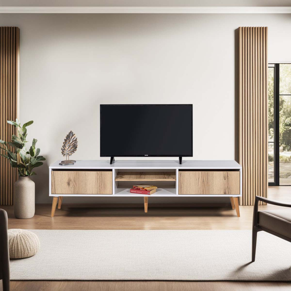 Κονσόλα τηλεόρασης σε μαύρο χρώμα με μίνιμαλ σχεδιασμό. Διαθέτει αποθηκευτικό χώρο ιδανικό για την τοποθέτηση βιβλίων, αξεσουάρ κ.α. Αποτελεί μια πρακτική και κομψή λύση για τον χώρο σας. Το προϊόν έρχεται αμοντάριστο και συναρμολογείται βάσει οδηγιών.