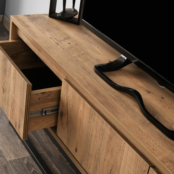 Κονσόλα τηλεόρασης σε φυσικό χρώμα ξύλου και μαύρη βάση. Χάρη στον σχεδιασμό της, αποτελεί την ιδανική επιλογή για έναν μοντέρνο και κομψό χώρο. Προσφέρει άνετη επιφάνεια για την τοποθέτηση της τηλεόρασής σας, ενώ τα ευρύχωρα συρτάρια του, παρέχουν αποθηκευτικό χώρο για βιβλία και αξεσουάρ. Το προϊόν έρχεται αμοντάριστο και συναρμολογείται βάσει οδηγιών.