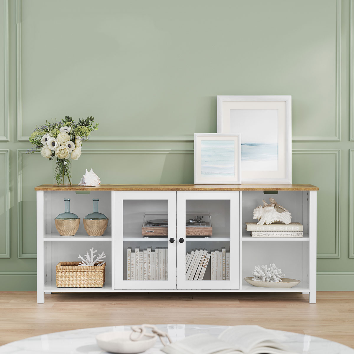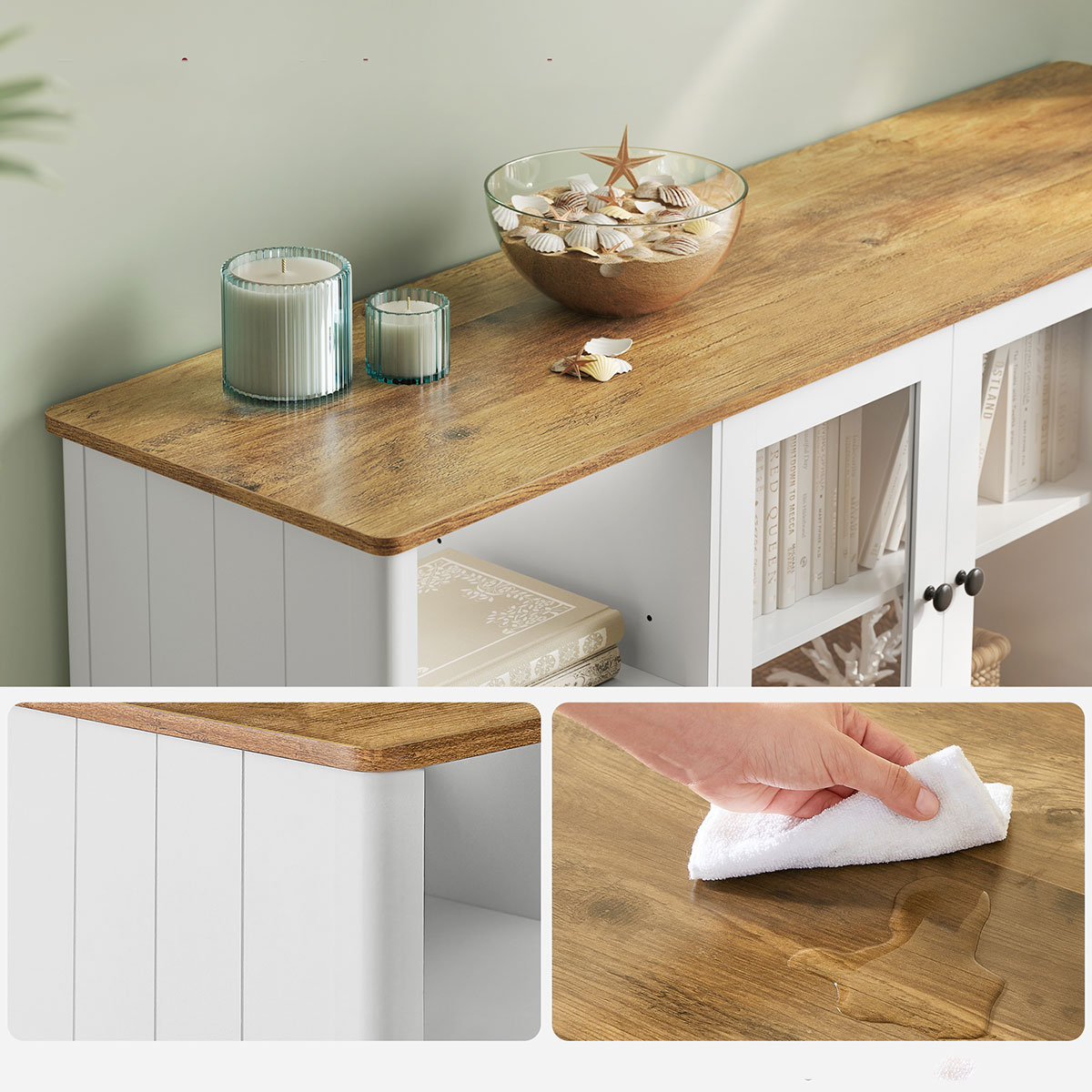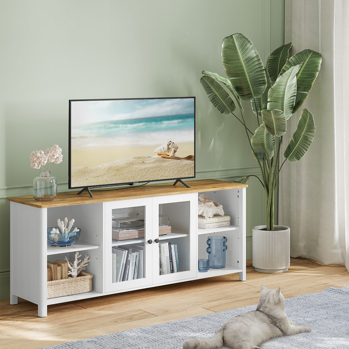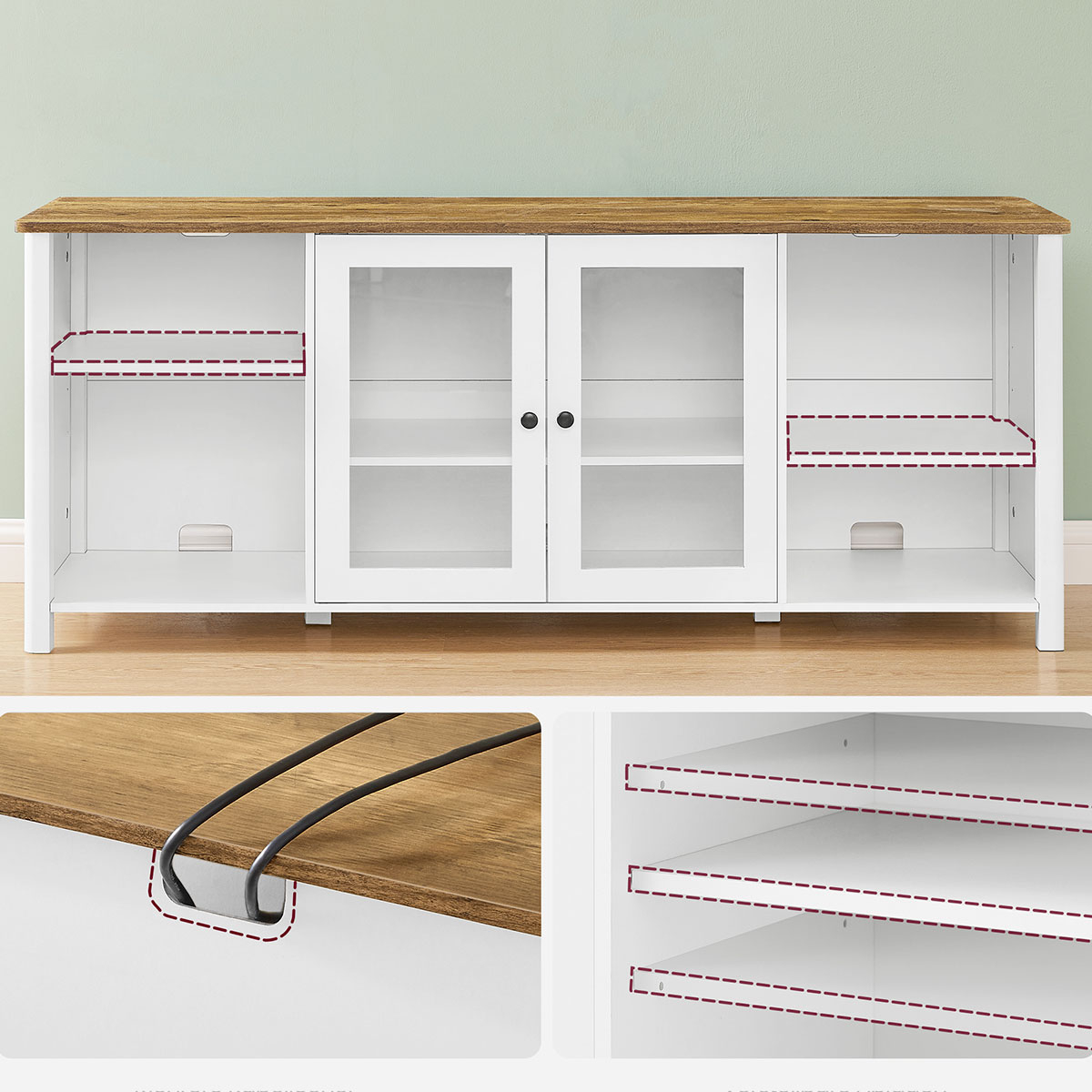 Κονσόλα τηλεόρασης σε λευκό χρώμα από την εταιρεία Vasagle. Διαθέτει αποθηκευτικούς χώρους για να αποθηκεύετε τα πράγματά σας και να οργανώσετε τον χώρο σας. Το προϊόν έρχεται αμοντάριστο και συναρμολογείται βάσει οδηγιών.