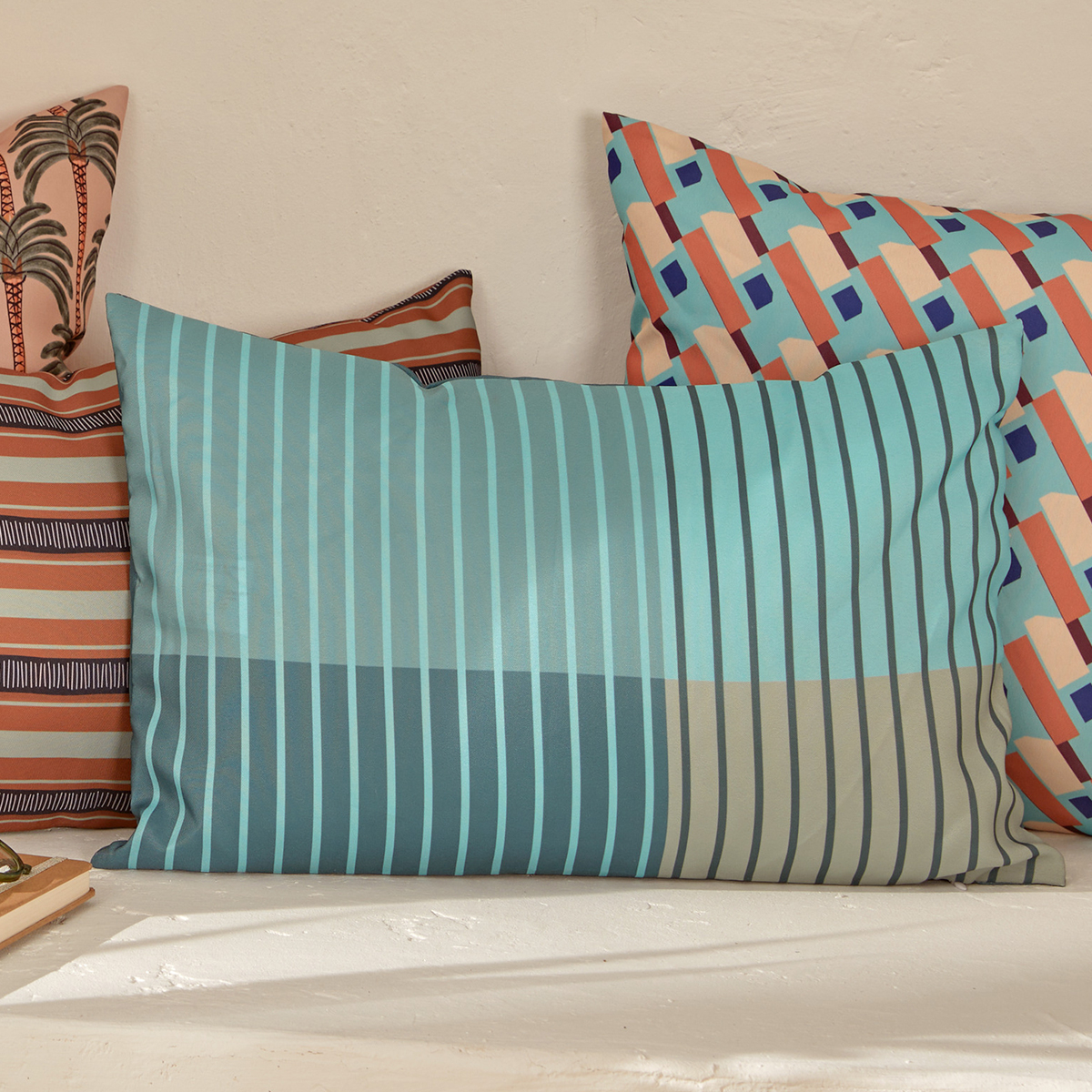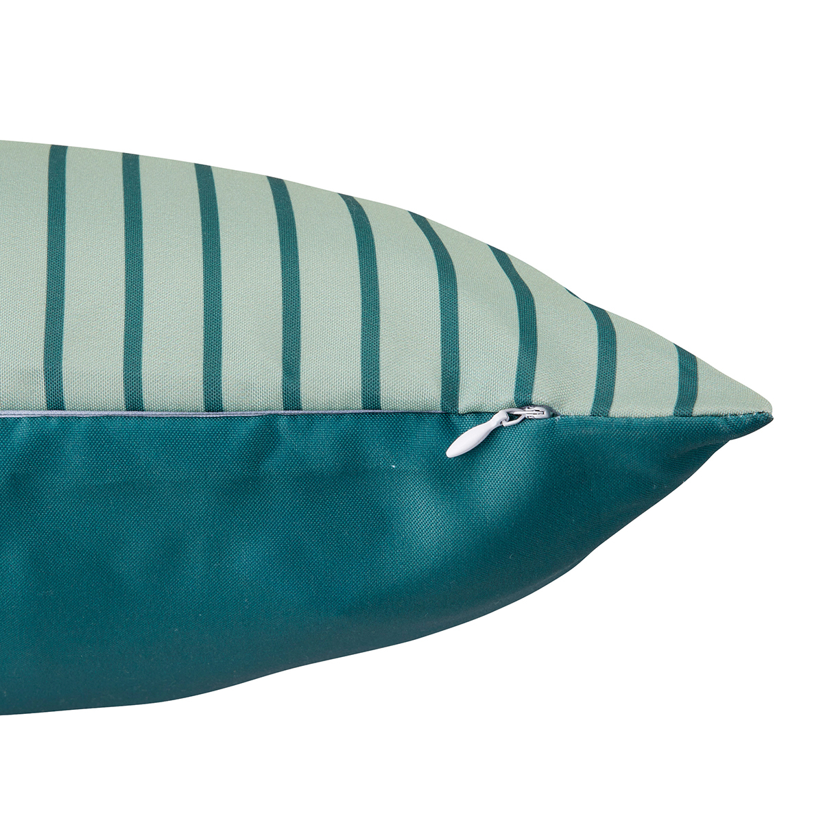 Διακοσμητική μαξιλάροθήκη σε γαλάζιες αποχρώσεις με ριγέ σχέδιο. Η πίσω μεριά είναι μονόχρωμη πετρόλ. Το ύφασμα είναι αδιάβροχο από 100% polyester. Κατάλληλο για να στολίσει οποιονδήποτε εσωτερικό ή εξωτερικό χώρο.