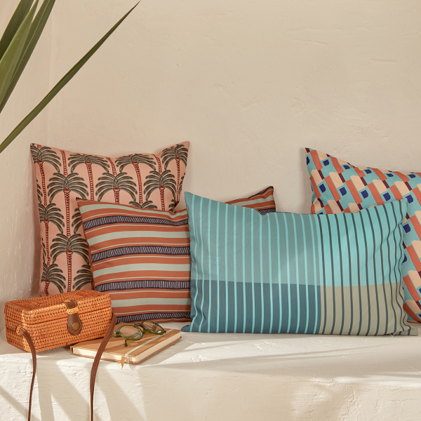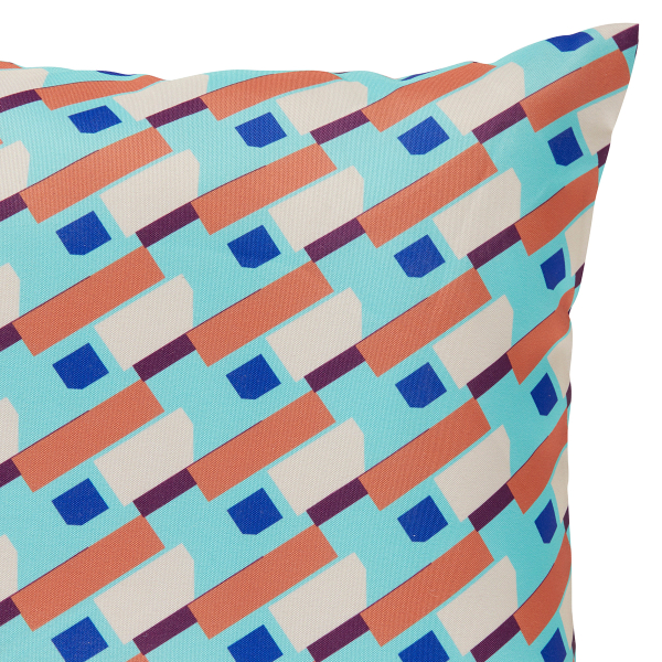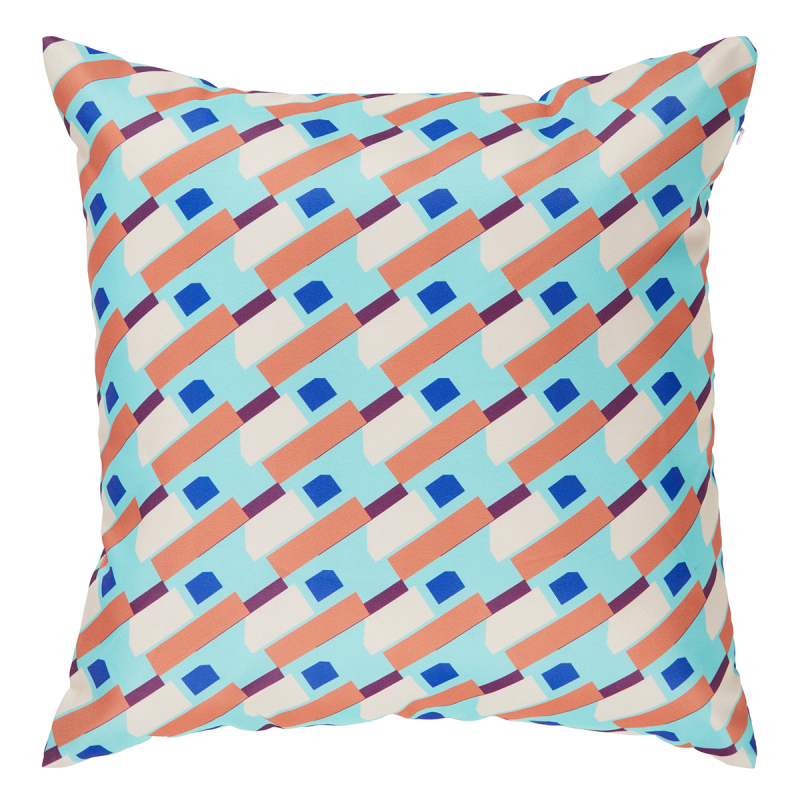 Διακοσμητική μαξιλάροθήκη με μοντέρνο πολύχρωμο σχέδιο. Η πίσω μεριά είναι μονόχρωμη σε βιολετί χρώμα. Το ύφασμα είναι αδιάβροχο από 100% polyester. Κατάλληλο για να στολίσει οποιονδήποτε εσωτερικό ή εξωτερικό χώρο.