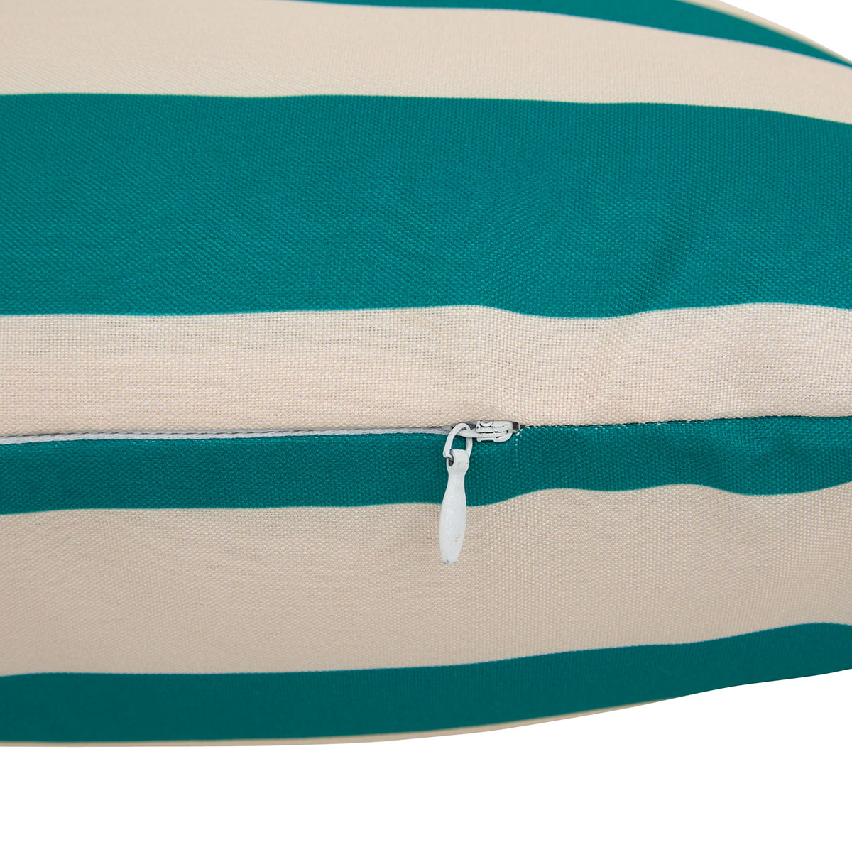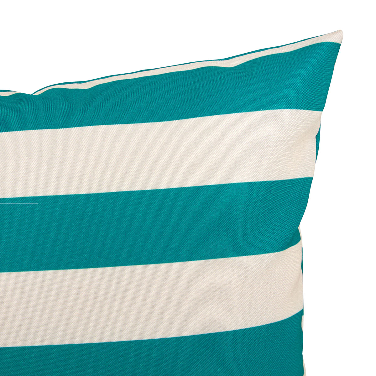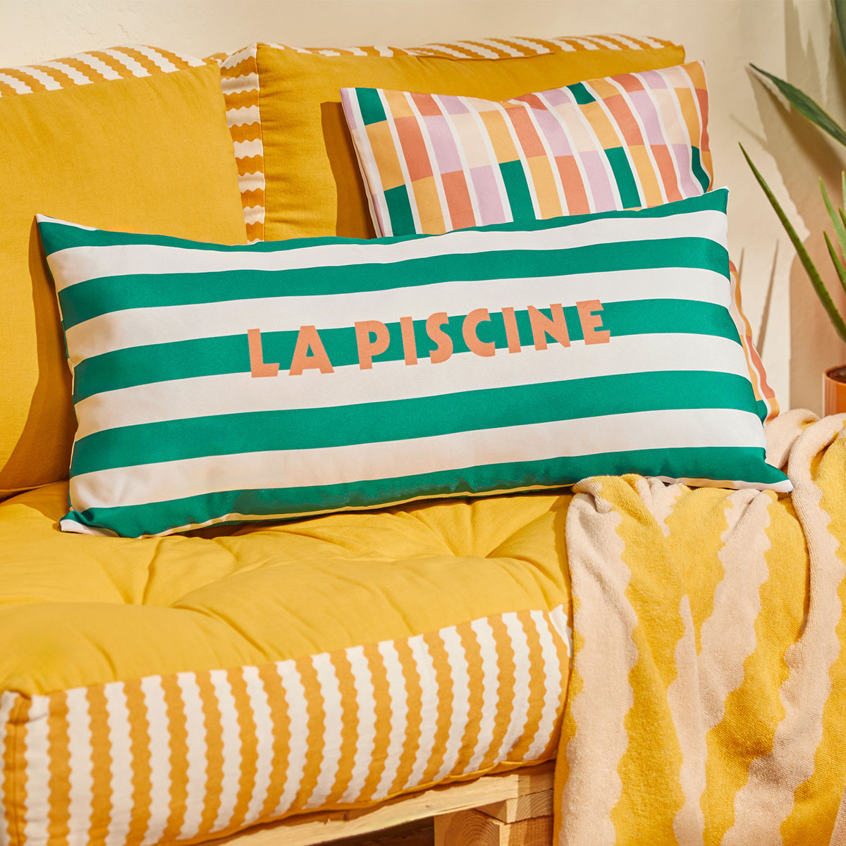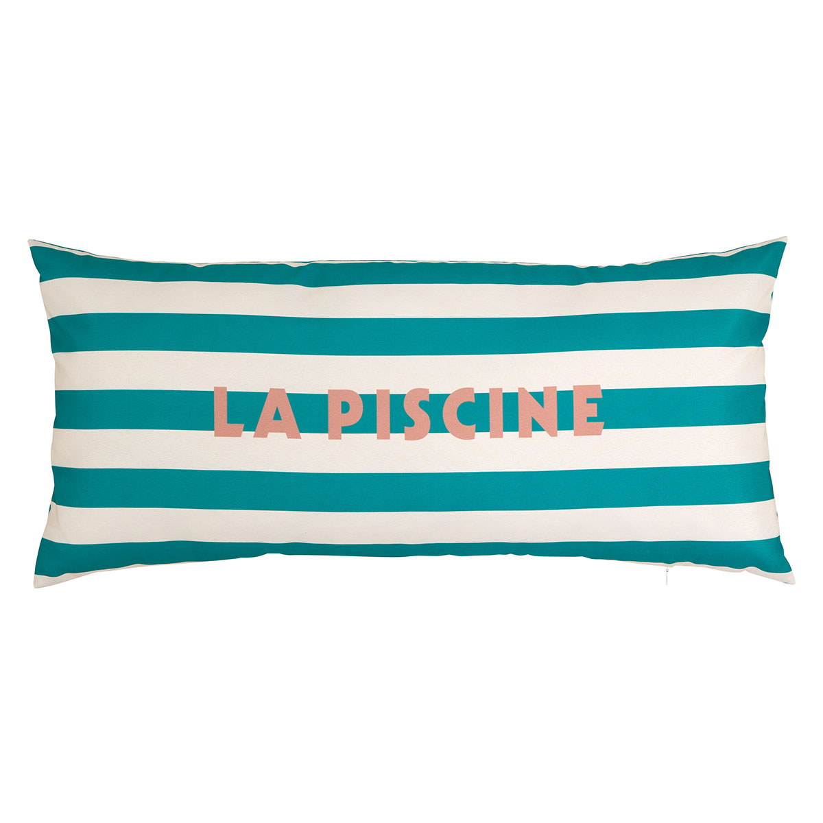 Διακοσμητικό μαξιλάρι σε τυρκουάζ χρώμα με εκρού ρίγες και τη φράση “LA PISCINE” σε σομόν χρώμα. Το εξωτερικό ύφασμα είναι κατασκευασμένο από 100% polyester με επεξεργασία που επιτρέπει στο νερό να γλιστράει χωρίς να διεισδύσει στο υλικό ενώ το εσωτερικό γέμισμα είναι από πολυεστερική βάτα. Διαθέτει φερμουάρ για να αφαιρείται η γέμιση και να πλένεται. Ιδανικό για να διακοσμήσει τον κήπο ή το μπαλκόνι σας καθώς αποπνέει καλοκαιρινή, resort αισθητική και χαλαρότητα. Ύφασμα με πιστοποίηση OEKO-TEX. Συνδυάστε το με τα υπόλοιπα προϊόντα του ίδιου σετ για ολοκληρωμένη διακόσμηση του εξωτερικού σας χώρου.