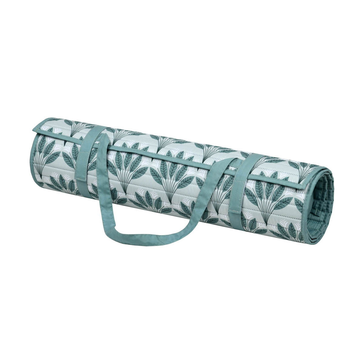 Υφασμάτινο στρωματάκι ξαπλώστρας με μαξιλάρι και φλοράλ σχέδιο σε πράσινες αποχρώσεις. Είναι κατασκευασμένο από αδιάβροχο ύφασμα 100% polyester. Έρχεται σε ρολό για να το μεταφέρετε εύκολα και έχει κορδονάκια που δένουν για να παραμένει κλειστό. Χρησιμοποιείται και ως ψάθα παραλίας. Ιδανικό για το κήπο ή τη παραλία.