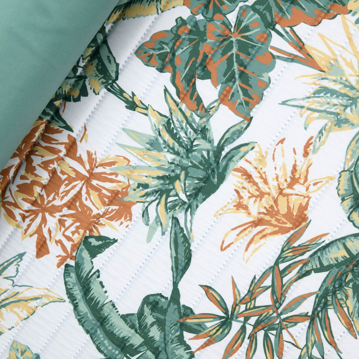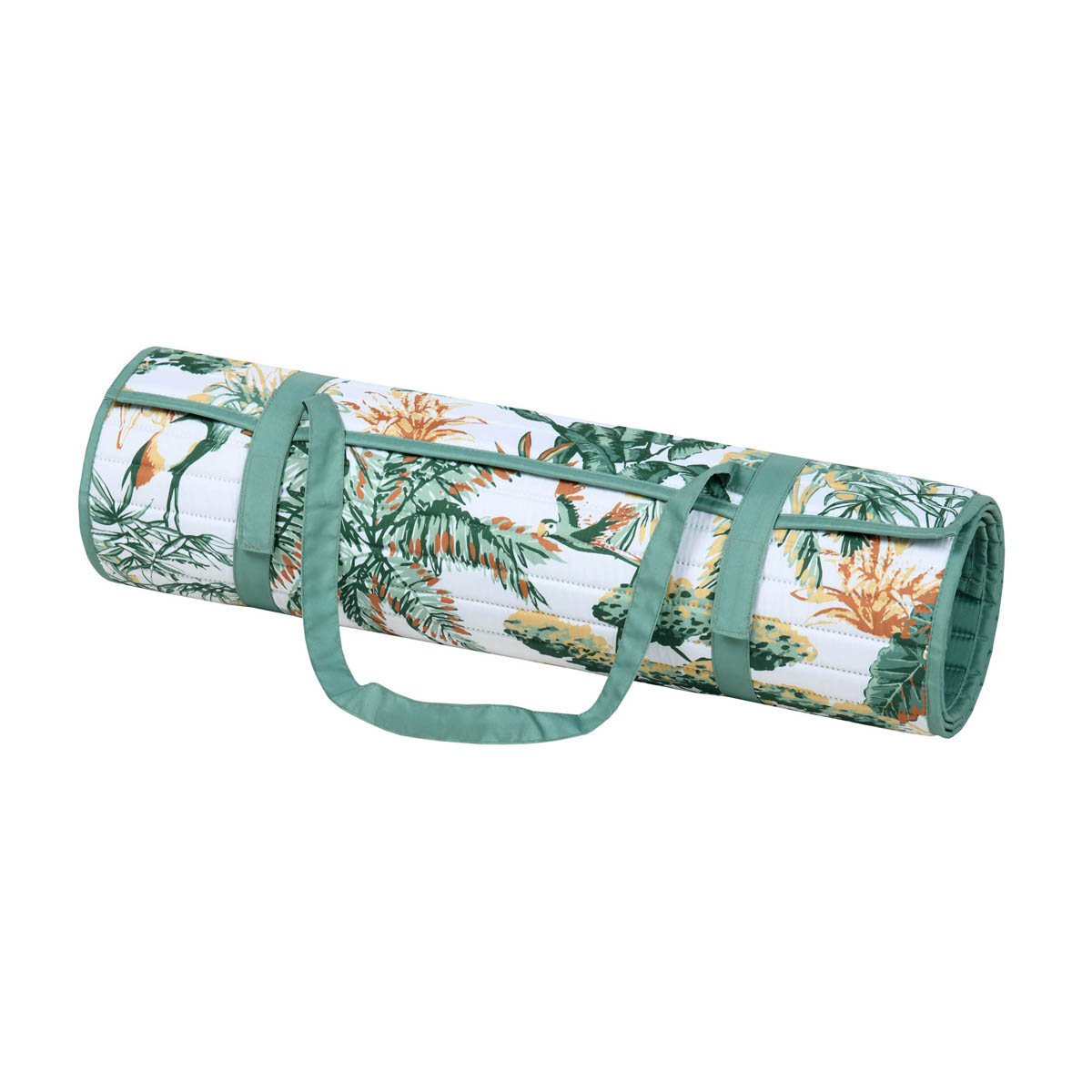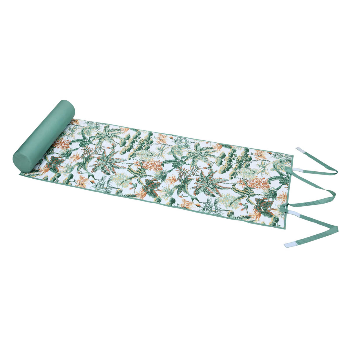 Υφασμάτινο στρωματάκι ξαπλώστρας με μαξιλάρι, tropical σχέδιο σε πράσινες αποχρώσεις και λευκές-μπεζ λεπτομέρειες. Είναι κατασκευασμένο από αδιάβροχο ύφασμα 100% polyester. Έρχεται σε ρολό για να το μεταφέρετε εύκολα και έχει κορδονάκια που δένουν για να παραμένει κλειστό. Χρησιμοποιείται και ως ψάθα παραλίας. Ιδανικό για το κήπο ή τη παραλία.