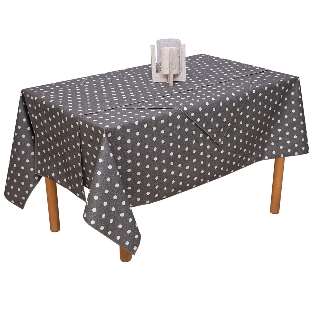 Αλέκιαστο τραπεζομάντηλο 140x140 της εταιρείας Viopros σε σκούρο γκρι χρώμα με λευκές λεπτομέρειες και πουά σχέδιο. Το ύφασμα είναι από 50% βαμβάκι - 50% polyester με διπλή ακρυλική επίστρωση που το καθιστά πολύ πρακτικό και εύχρηστο. Ιδανικό για το τραπέζι της κουζίνας, την τραπεζαρία σας ή το τραπέζι του κήπου σας.
