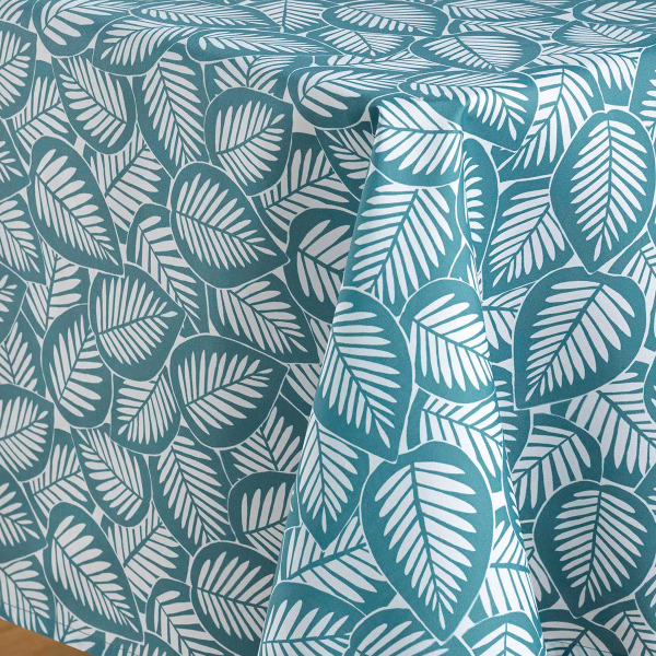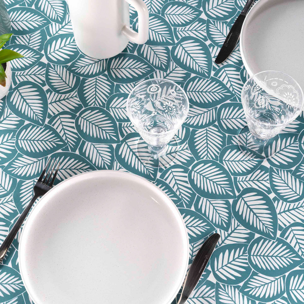 Αλέκιαστο παραλληλόγραμμο τραπεζομάντηλο σε μπλε απόχρωση με λευκό tropical σχέδιο. Το ύφασμα από 100% microfiber polyester και η αλέκιαστη ιδιότητά του, το καθιστούν πολύ πρακτικό και εύχρηστο στην καθημερινότητα. Ιδανικό τραπεζομάντηλο για να ανανεώσει την αισθητική του χώρου.