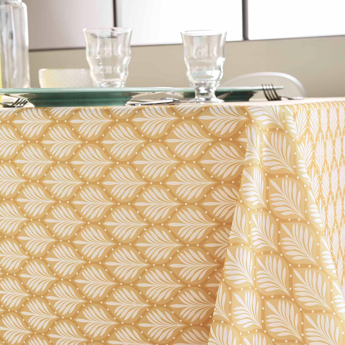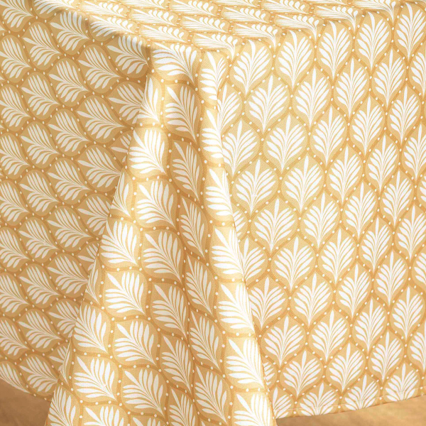 Αλέκιαστο παραλληλόγραμμο τραπεζομάντηλο σε κίτρινη απόχρωση με λευκό tropical σχέδιο. Το ύφασμα από 100% polyester και η αλέκιαστη ιδιότητά του, το καθιστούν πολύ πρακτικό και εύχρηστο στην καθημερινότητα. Ιδανικό τραπεζομάντηλο για να ανανεώσει την αισθητική του χώρου.