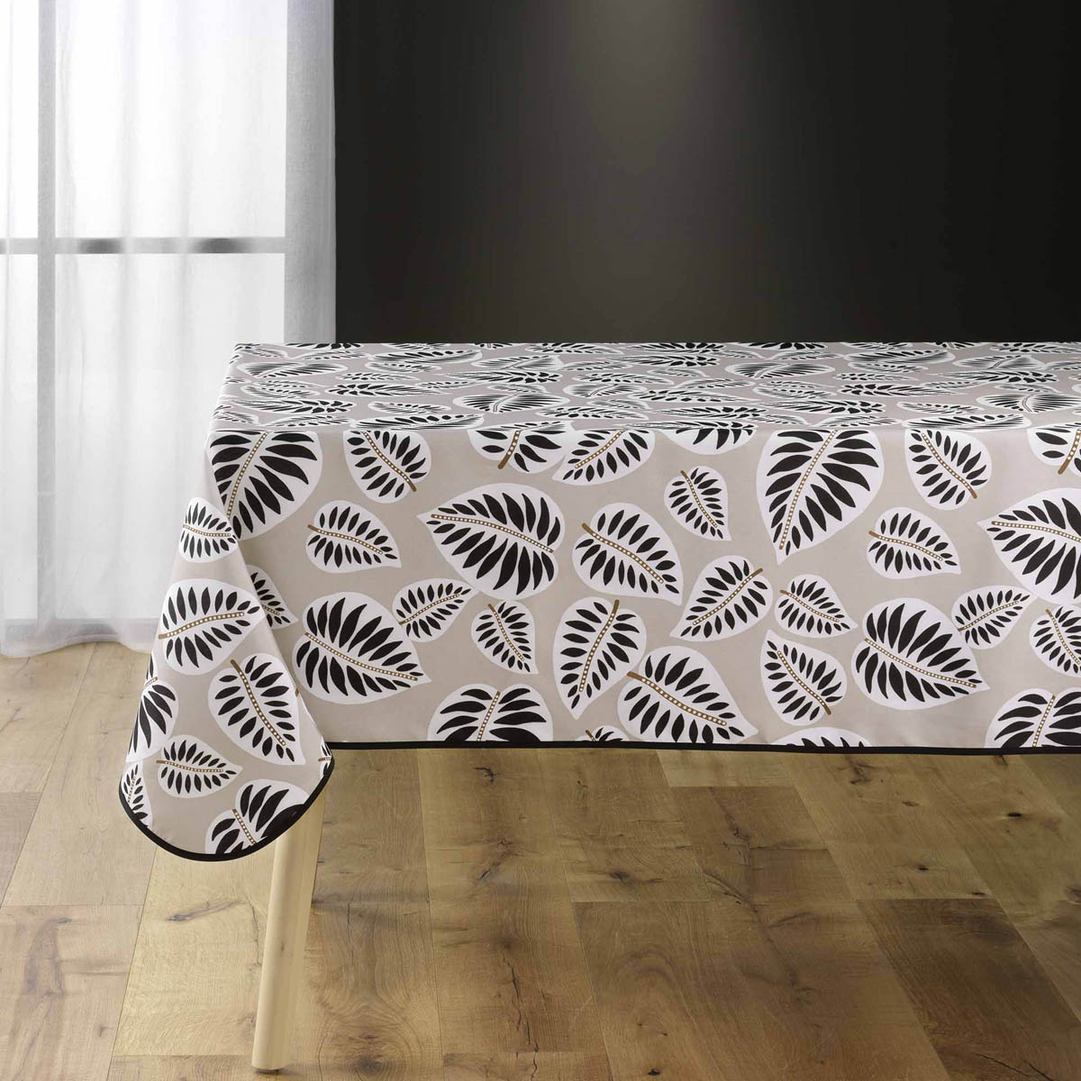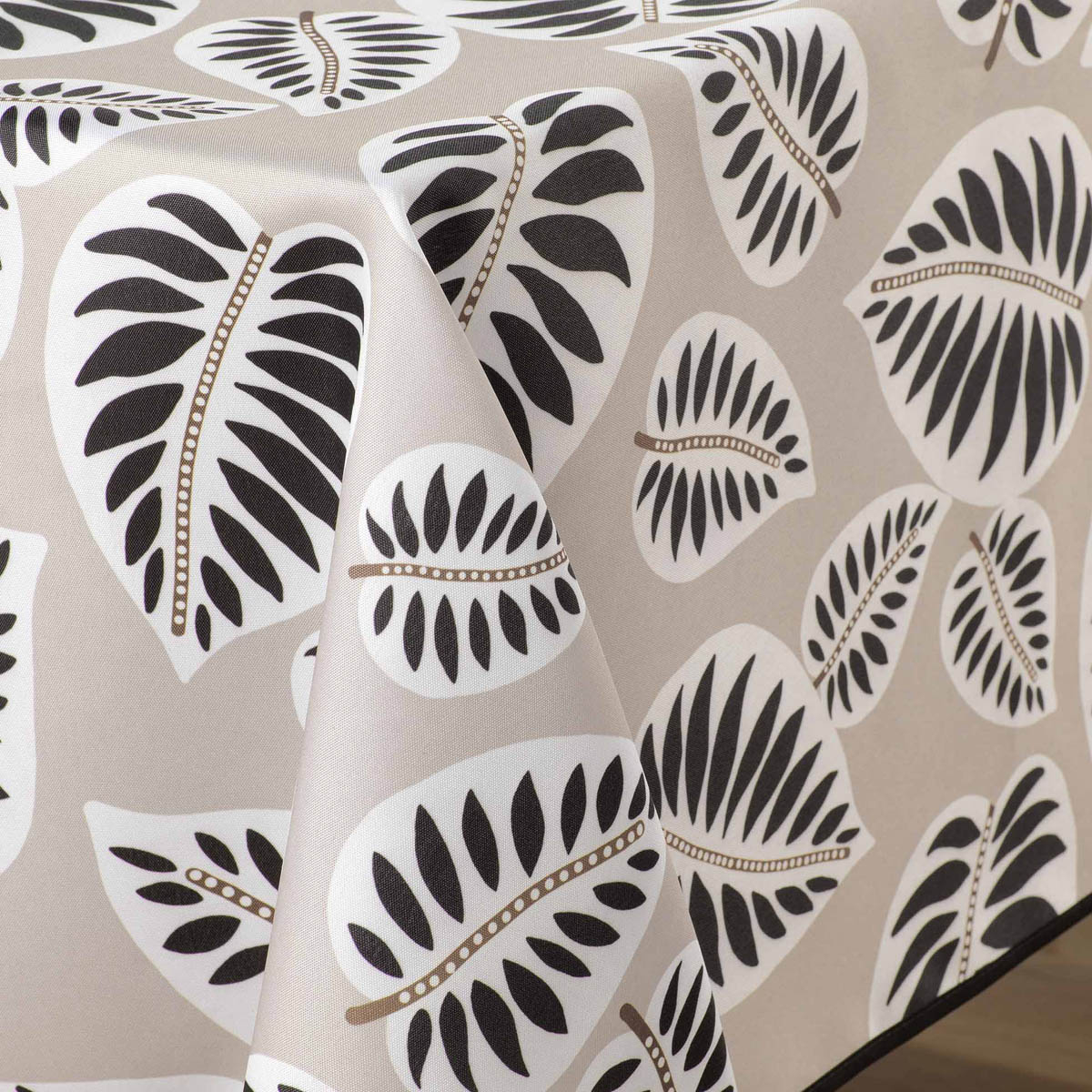 Αλέκιαστο παραλληλόγραμμο τραπεζομάντηλο με φλοράλ σχέδιο σε μπεζ-μαύρο χρώμα και καφέ-λευκές λεπτομέρειες. Το ύφασμα από 100% polyester και η αλέκιαστη ιδιότητά του, το καθιστούν πολύ πρακτικό και εύχρηστο για κάθε μέρα.