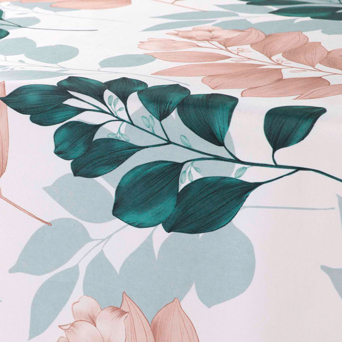 Αλέκιαστο τραπεζομάντηλο με λευκό φόντο και μοντέρνο σχέδιο με σομόν-πράσινες κλάρες. Το ύφασμα από 100% polyester και η αλέκιαστη ιδιότητά του, το καθιστούν πολύ πρακτικό και εύχρηστο στην καθημερινότητα. Συνδυάστε το με τα υπόλοιπα είδη της σειράς για ένα ολοκληρωμένο αποτέλεσμα.