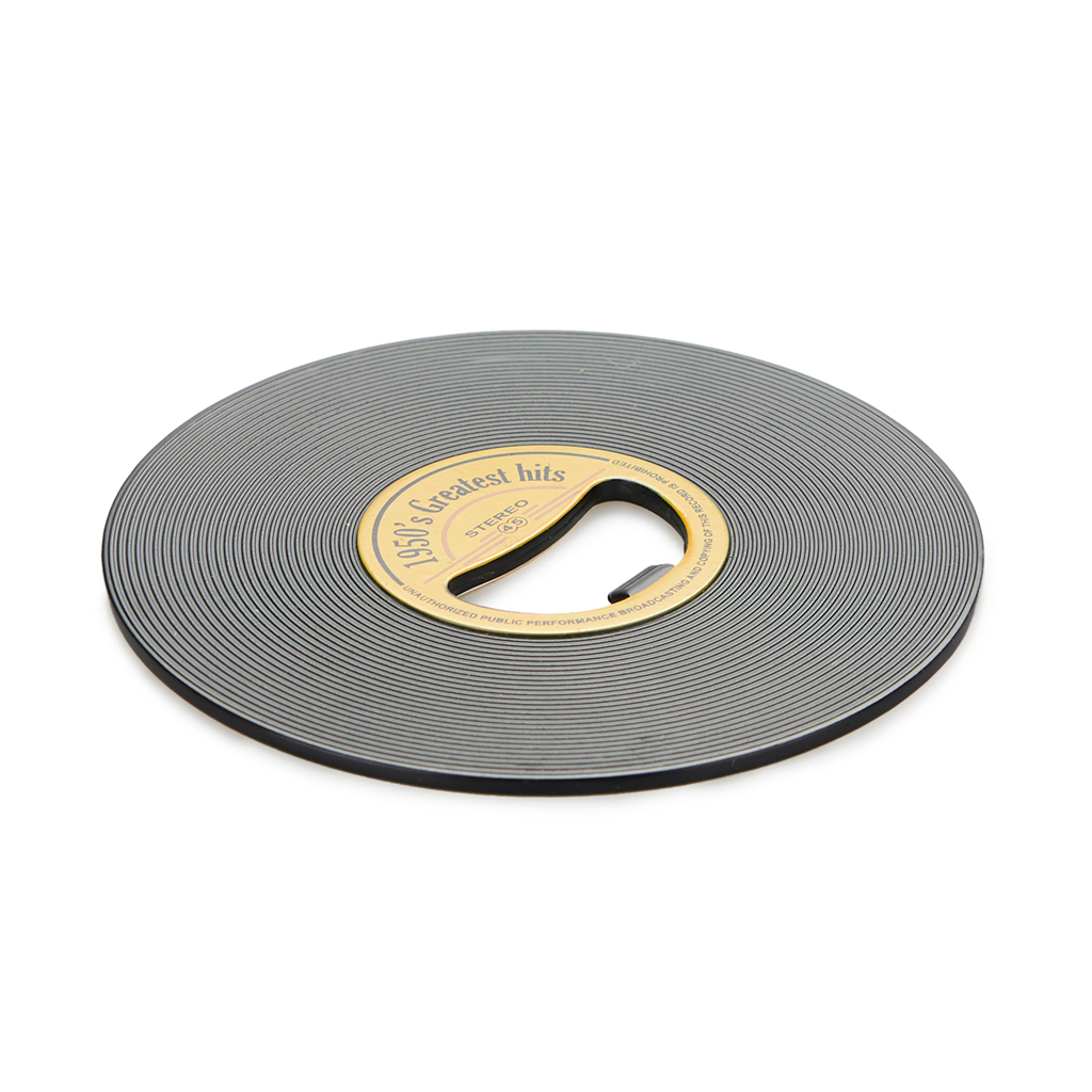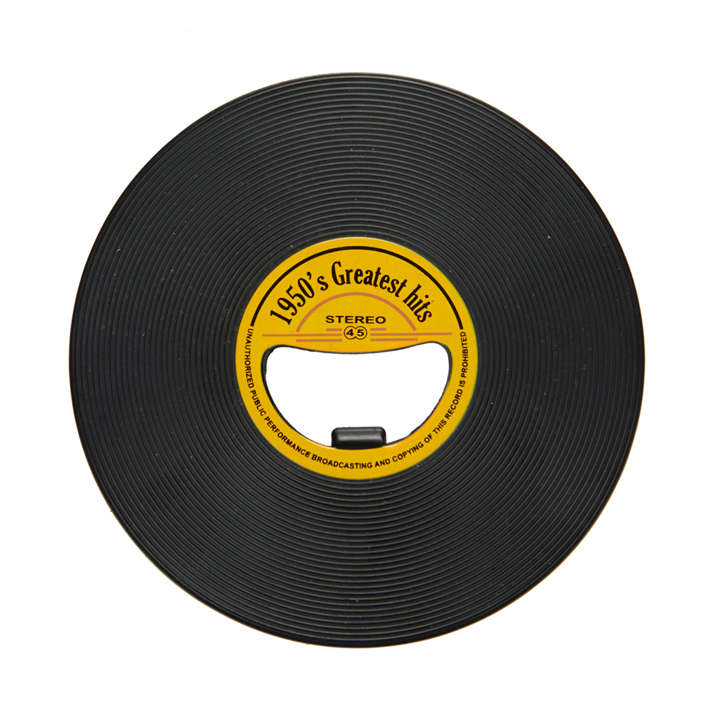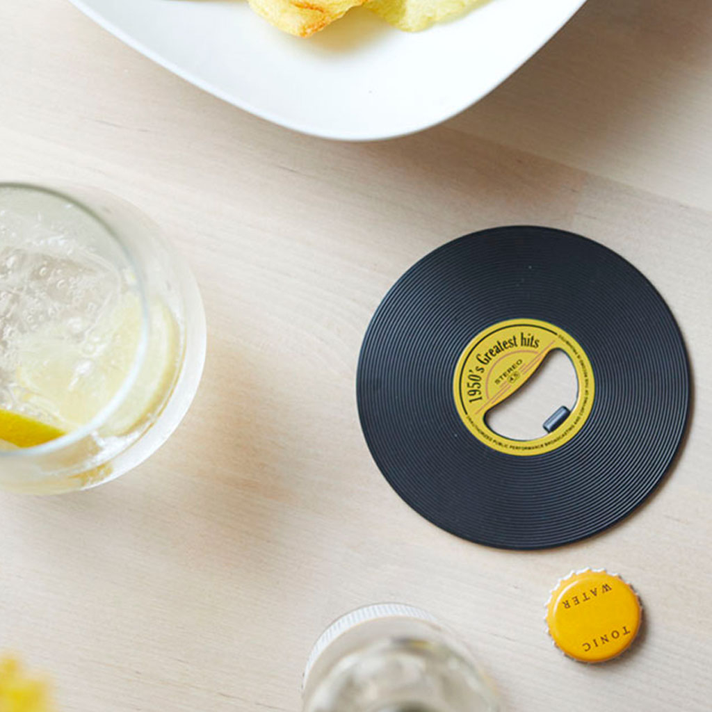 Ανοιχτήρι μπουκαλιών σε μαύρο χρώμα με κίτρινες λεπτομέρειες και σχέδιο δίσκου βινυλίου από την εταιρεία Octopus. Είναι κατασκευασμένο από ψευδάργυρο ένα μέταλλο υψηλής αντοχής. Ιδανικό μέγεθος για εύκολη μεταφορά παντού. Δώστε στην κουζίνα σας μια μοντέρνα πινελιά!
