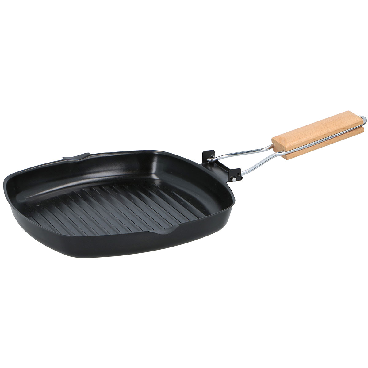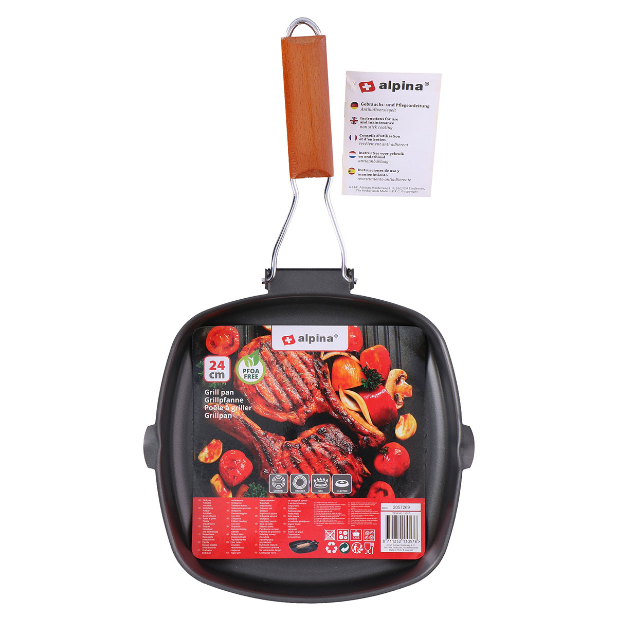Γκριλιέρα με διπλή αντικολλητική επίστρωση, από την εταιρεία Alpina. Είναι κατασκευασμένη από αλουμίνιο υψηλής ποιότητας πάχους 1mm. Διαθέτει μπεζ λαβή κατασκευασμένη από ξύλο η οποία είναι σπαστή για να πιάνει λιγότερο χώρο στο ντουλάπι. Κατάλληλη για όλες τις εστίες συμπεριλαμβανομένης της επαγωγικής. Συνιστάται πλύσιμο στο χέρι.
