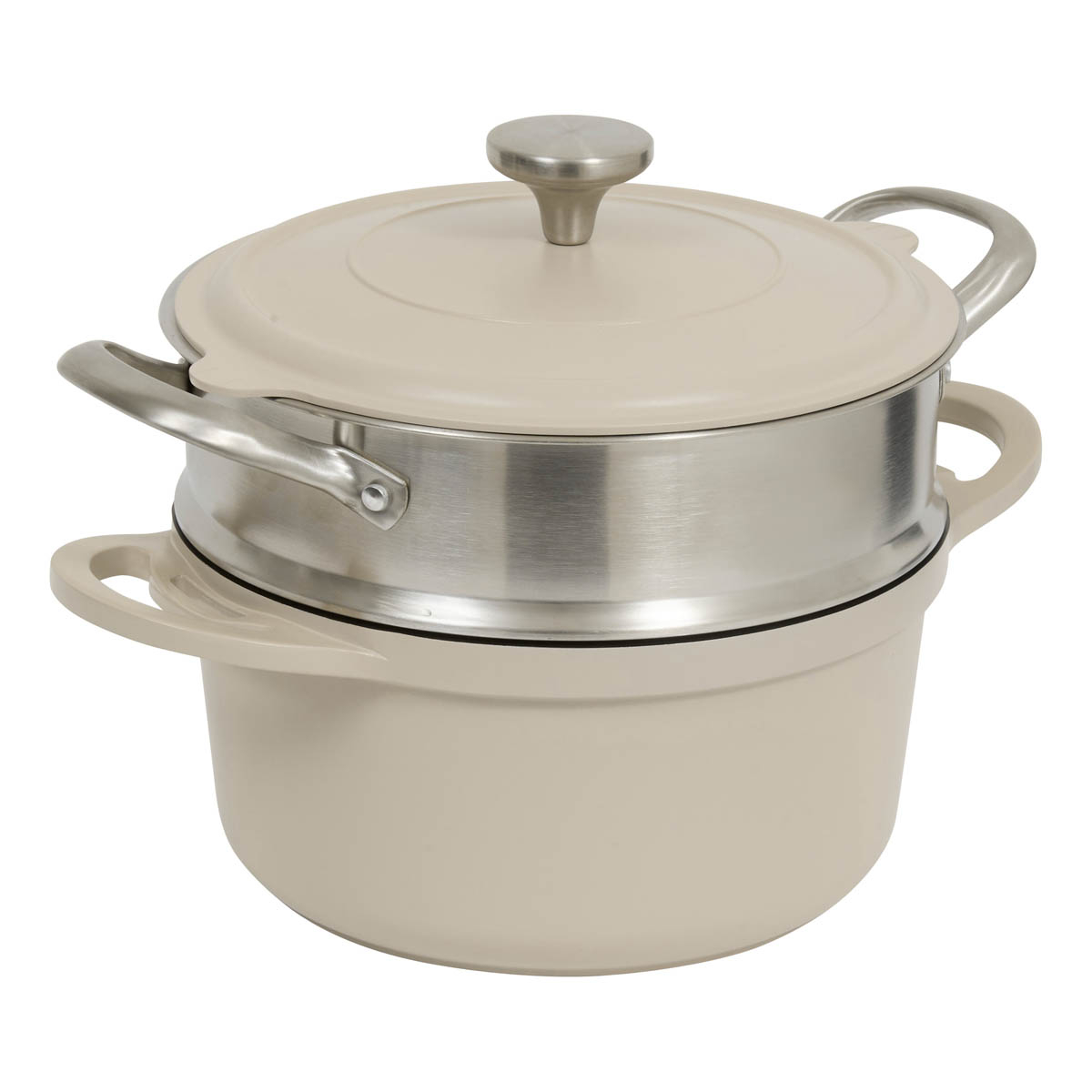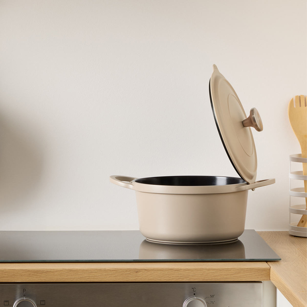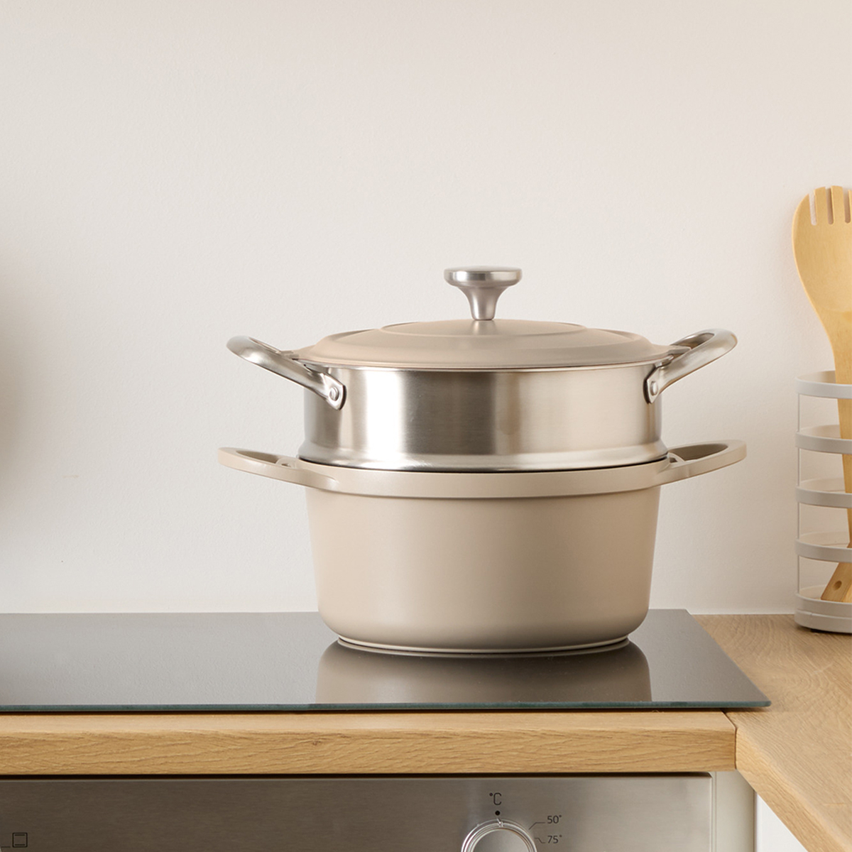 Αντικολλητική κατσαρόλα χυτού αλουμινίου σε μπεζ χρώμα. Διαθέτει αποσπώμενο καλάθι ατμού από ανοξείδωτο υλικό, για εύκολο και υγιεινό μαγείρεμα στον ατμό. Το χυτό αλουμίνιο καθιστά το σκεύος πιο στιβαρό και το μαγείρεμα πιο ομοιόμορφο. Ο ενισχυμένος πάτος της προσφέρει ομοιόμορφη κατανομή της θερμοκρασίας για τέλειο ψήσιμο και γρήγορο μαγείρεμα. Το πρακτικό καπάκι από το ίδιο υλικό, μπορεί να στηριχτεί στις λαβές της κατσαρόλας. Κατάλληλη για εστίες αλογόνου, ηλεκτρικές εστίες, κεραμικές, επαγωγικές και εστίες υγραερίου. Μπορεί να τοποθετηθεί και στο πλυντήριο πιάτων. Ιδανικό σκεύος για εύκολο και ασφαλές μαγείρεμα. Το σετ περιλαμβάνει και μία ξύλινη κουτάλα.