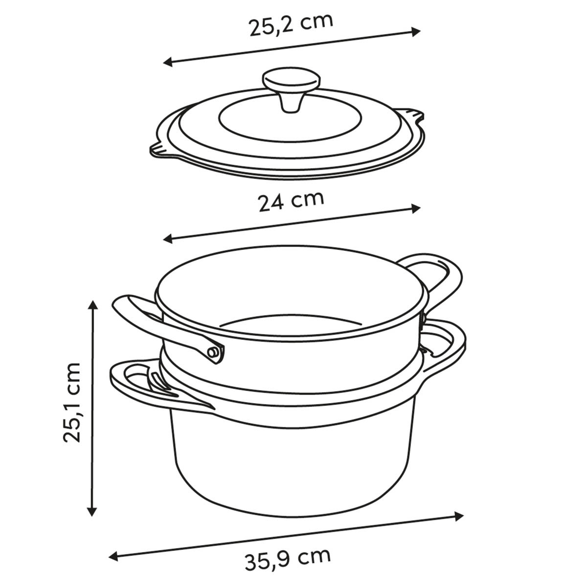 • Τεμάχια: 1 Κουτάλα, 1 Αντικολλητική Κατσαρόλα Με Καλάθι Ατμού 35.9εκ.Μx24εκ.Πx25.1εκ. Συνολικό Ύψος, Με Εσωτερική Διάμετρο 24εκ., 1 Καπάκι Φ25.2εκ.