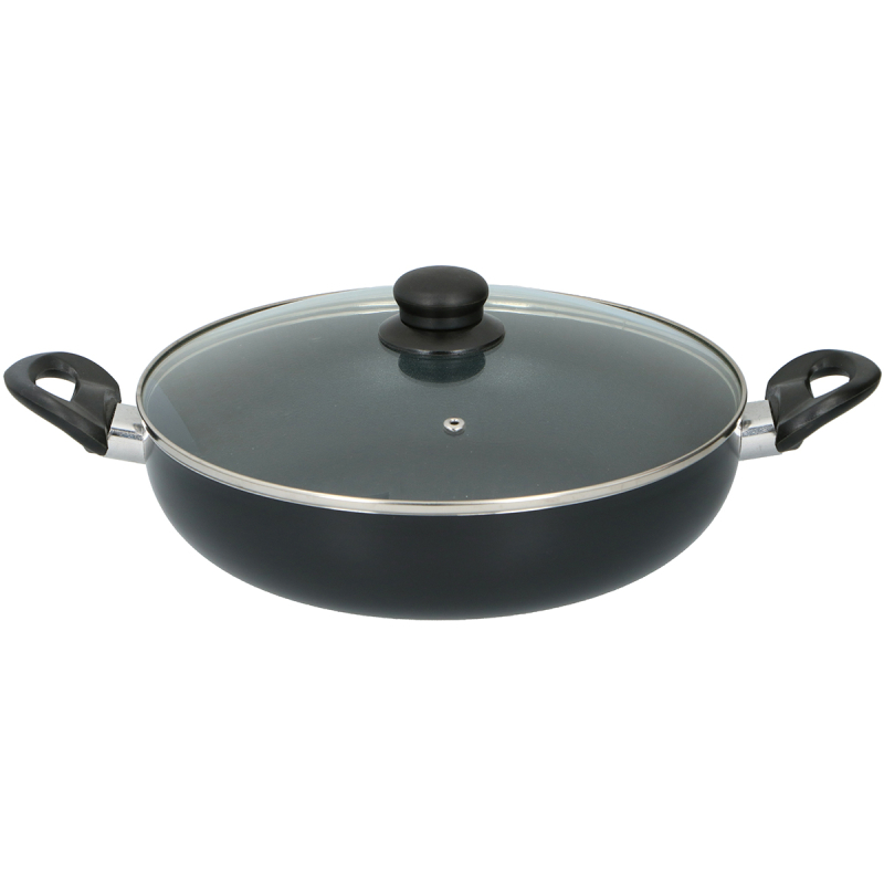 Αντικολλητική κατσαρόλα με καπάκι σε μαύρο χρώμα της σειράς Chef de Luxe από την εταιρεία Alpina. Είναι κατασκευασμένη από αλουμίνιο και διαθέτει διπλή αντικολλητική επίστρωση ILAG πάχους 2 χιλιοστών για καλύτερη απόδοση στο μαγείρεμα σας. Προσφέρει ομοιόμορφη κατανομή της θερμοκρασίας για τέλειο ψήσιμο και γρήγορο μαγείρεμα. Το γυάλινο πυράντοχο καπάκι περιβάλλεται από ανοξείδωτο στεφάνι και έχει λαβή για ασφαλές και άνετο κράτημα. Σας επιτρέπει να παρακολουθείτε τη διαδικασία μαγειρέματος, ενώ παράλληλα συγκρατεί τις πιτσιλιές. Διαθέτει λαβές για εύκολη μεταφορά. Είναι κατάλληλο για όλες τις πηγές θερμότητας συμπεριλαμβανομένης της επαγωγικής με μέγιστη θερμοκρασία 230°. Το τηγάνι είναι χωρίς PFOA.