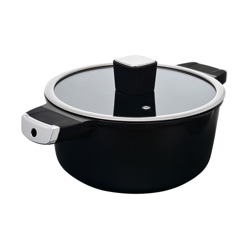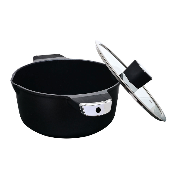 Αντικολλητική κατσαρόλα με χωρητικότητα 4.3 λίτρα σε μαύρο χρώμα της εταιρείας εstia και διαθέτει πιστοποίηση Cookmark. Είναι κατασκευασμένη από χυτό αλουμίνιο υψηλής ποιότητας και αντοχής με αντικολλητικές ιδιότητες. Διαθέτει τριπλή αντικολλητική επίστρωση για καλύτερη απόδοση στο μαγείρεμα σας. Επίσης, έχει ενισχυμένη εξωτερική επιφάνεια. Το γυάλινο πυράντοχο καπάκι που περιβάλλεται από στεφάνι ανοξείδωτου ατσαλιού. Οι εργονομικές και αντιολισθητικές λαβές από βακελίτη παραμένουν κρύες για ασφαλές και άνετο κράτημα. Προσφέρει ομοιόμορφη κατανομή της θερμοκρασίας για τέλειο ψήσιμο και γρήγορο μαγείρεμα. Κατάλληλη για εστίες αλογόνου, ηλεκτρικές εστίες, κεραμικές, επαγωγικές και εστίες υγραερίου. Ιδανικό σκεύος για εύκολο και ασφαλές μαγείρεμα.