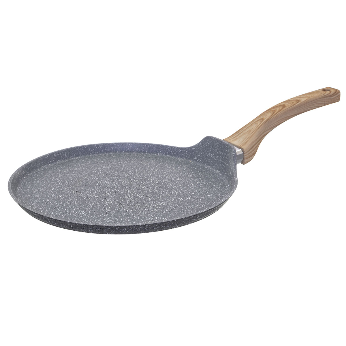 Κρεπιέρα διαμέτρου 28εκ. με διπλή αντικολλητική επίστρωση σε γκρι χρώμα. Είναι κατασκευασμένη από σφυρήλατο αλουμίνιο υψηλής ποιότητας πάχους 2.2mm με μεγάλη αντοχή στις γρατζουνιές και στις υψηλές θερμοκρασίες. Διαθέτει εργονομική λαβή βακελίτη για να παραμένει κρύα κατά το μαγείρεμα. Διαχέει αργά την θερμοκρασία σε όλη την επιφάνεια για ομοιόμορφο και σωστό ψήσιμο. Η βάση είναι ανοξείδωτη με πάχος 3mm. Κατάλληλη για όλες τις εστίες συμπεριλαμβανομένης της επαγωγικής. Συνιστάται πλύσιμο στο χέρι. Ιδανικό σκεύος για να φτιάξετε εύκολα κρέπες και pancakes.