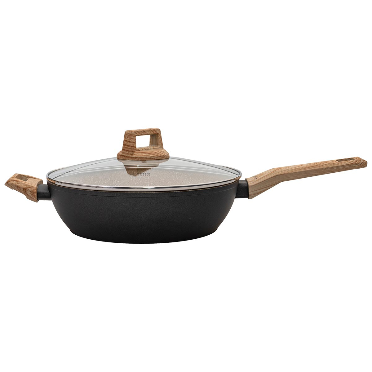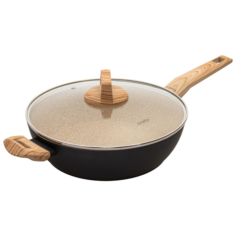 Αντικολλητική σωτέζα με χωρητικότητα 4 λίτρα και καπάκι σε μπεζ-μαύρο χρώμα της εταιρείας εstia. Είναι κατασκευασμένη από πρεσσαριστό αλουμίνιο πάχους 3.0 mm, ενώ διαθέτει τριπλή μαρμάρινη αντικολλητική επίστρωση για καλύτερη απόδοση στο μαγείρεμα σας. Προσφέρει ομοιόμορφη κατανομή της θερμοκρασίας για τέλειο ψήσιμο και γρήγορο μαγείρεμα. Έχει ενισχυμένη ανθεκτικότητα στα γδαρσίματα προσφέροντας μεγαλύτερη διάρκεια ζωής. Το γυάλινο πυράντοχο καπάκι περιβάλλεται από ανοξείδωτο στεφάνι ενώ οι εργονομικές αντιολισθητικές της λαβές από βακελίτη παραμένουν κρύες για ασφαλές και άνετο κράτημα. Τα αντικολλητικά μαγειρικά σκεύη από πρεσσαριστό αλουμίνιο είναι ιδανικά για τηγάνισμα, ψήσιμο κρεάτων, σοτάρισμα λαχανικών λόγω της στιβαρής κατασκευής τους, καθώς είναι ανεκτικά σε γδαρσμίματα και σε υψηλές θερμοκρασίες. Για τις οδηγίες χρήσης και φροντίδας μπορείτε να συμβουλευτείτε τις φωτογραφίες. Κατάλληλη για εστίες αλογόνου, ηλεκτρικές εστίες, κεραμικές, επαγωγικές και εστίες υγραερίου. Μπορεί να τοποθετηθεί και στο πλυντήριο πιάτων. Ιδανικό σκεύος για εύκολο και ασφαλές μαγείρεμα.