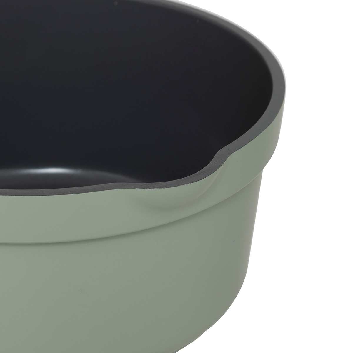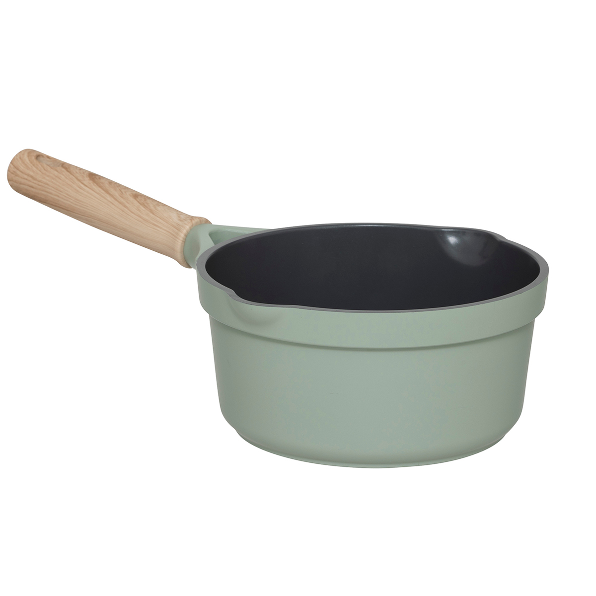 Αντικολλητικό κατσαρολάκι γάλακτος σε χακί χρώμα με λαβή με εφέ ξύλου. Είναι κατασκευασμένο από χυτό αλουμίνιο και διαθέτει διπλή αντικολλητική επίστρωση για καλύτερη απόδοση στο μαγείρεμα σας. Προσφέρει ομοιόμορφη κατανομή της θερμοκρασίας για τέλειο ψήσιμο και γρήγορο μαγείρεμα. Τα αντικολλητικά μαγειρικά σκεύη από χυτό αλουμίνιο είναι ιδανικά για τηγάνισμα, ψήσιμο κρεάτων, σοτάρισμα λαχανικών λόγω της στιβαρής κατασκευής τους, καθώς είναι ανεκτικά σε γδαρσίματα και σε υψηλές θερμοκρασίες. Κατάλληλο για εστίες αλογόνου, ηλεκτρικές εστίες, κεραμικές, επαγωγικές και εστίες υγραερίου. Δεν συνίσταται το πλύσιμο στο πλυντήριο πιάτων. Ιδανικό σκεύος για εύκολο και ασφαλές μαγείρεμα.