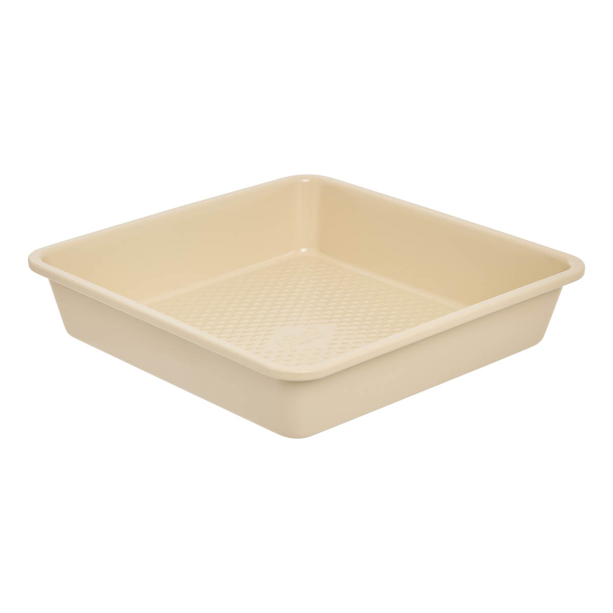 Τετράγωνο ταψί μεταλλικό σε μπεζ χρώμα. Είναι αντικολλητικό και καθαρίζεται εύκολα. Εξασφαλίζει ομοιόμορφη κατανομή της θερμότητας και αντοχή στη χρήση. Μπορεί να τοποθετηθεί και στο πλυντήριο πιάτων. Ιδανικό και ανθεκτικό σκεύος σχεδιασμένο για θερμοκρασίες έως 200C.