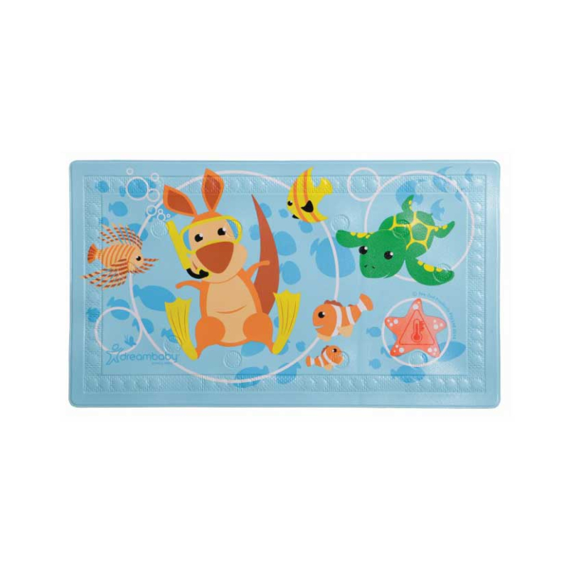Αντιολισθητικό πατάκι μπανιέρας από την εταιρεία Dream Baby με πολύχρωμα παιδικά σχέδια. Αποτελεί ιδανικό τρόπο για να αποφύγετε ατυχήματα από ολίσθηση στη μπανιέρα. Είναι από ανθεκτικό υλικό, που καθαρίζει εύκολα. Διαθέτει πολλές βεντούζες που συγκρατούν το πατάκι σταθερά στη θέση του. Έχει ένα θερμοευαίσθητο αστέρι που αλλάζει χρώμα για να σας προειδοποιεί όταν το νερό είναι πολύ ζεστό.