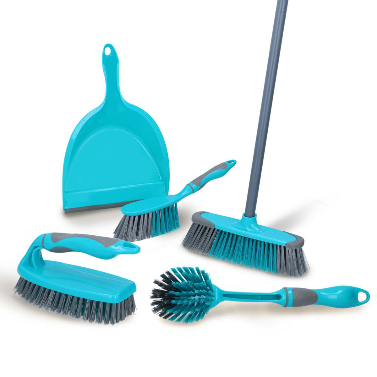 Αξεσουάρ καθαρισμού σε σετ 5 τεμαχίων. Έχουν γκρι χρώμα με γαλάζιες λεπτομέρειες και είναι κατασκευασμένα από πλαστικό υλικό. Το σετ περιλαμβάνει: 1 σκούπα με λαβή, 2 βούρτσες χειρός, 1 φαράσι, 1 βούρτσα πλυσίματος πιάτων. Οι βούρτσες διαθέτουν αντιολισθητική λαβή ώστε να μην γλιστρήσουν από το χέρι σας, ακόμη και σε συνδυασμό με νερό και καθαριστικό. Είναι κατάλληλο για εσωτερικούς και εξωτερικούς χώρους. Ιδανικό σετ που θα κάνει το καθάρισμα του σπιτιού ευκολότερο.