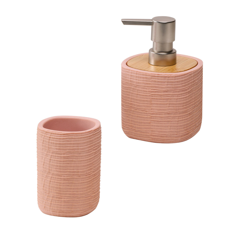 Ποτήρι για την οδοντόβουρτσα και δοχείο κρεμοσάπουνου από την εταιρεία Kentia. Είναι κατασκευασμένο από polyresin σε σομόν χρώμα με ανάγλυφη επιφάνεια. Ιδανικά για να οργανώσετε και να δώσετε στυλ στον νιπτήρα σας.